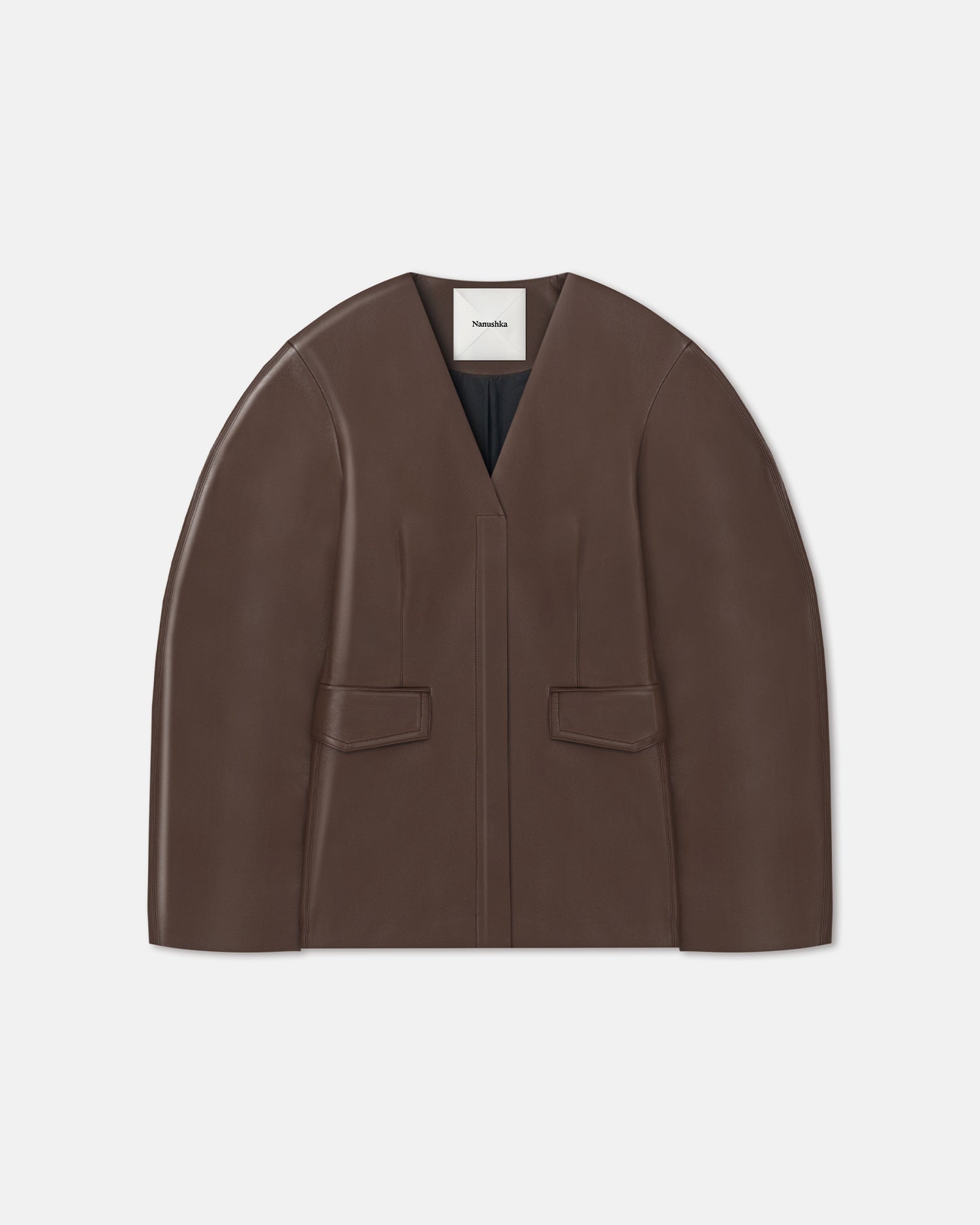 The Erina jacket is expertly tailored from regenerated leather in a rich chocolate tone. An appreciation of craftsmanship and simplicity, it has a collarless, concealed-button design, cinched-in waist and rounded sleeves. Fit Standard fit, matches usual sizing. Materials and Care Shell: Coating: Polyurethane Base: 100% Polyester Lining: 100% Viscose Do not wash, do not bleach, do not tumble dry, iron low heat (110°), gentle dry clean any solvent except trichloroethylene, do not wring Handle with care to ensure garment lifespan. Repair or resell to support circular fashion.