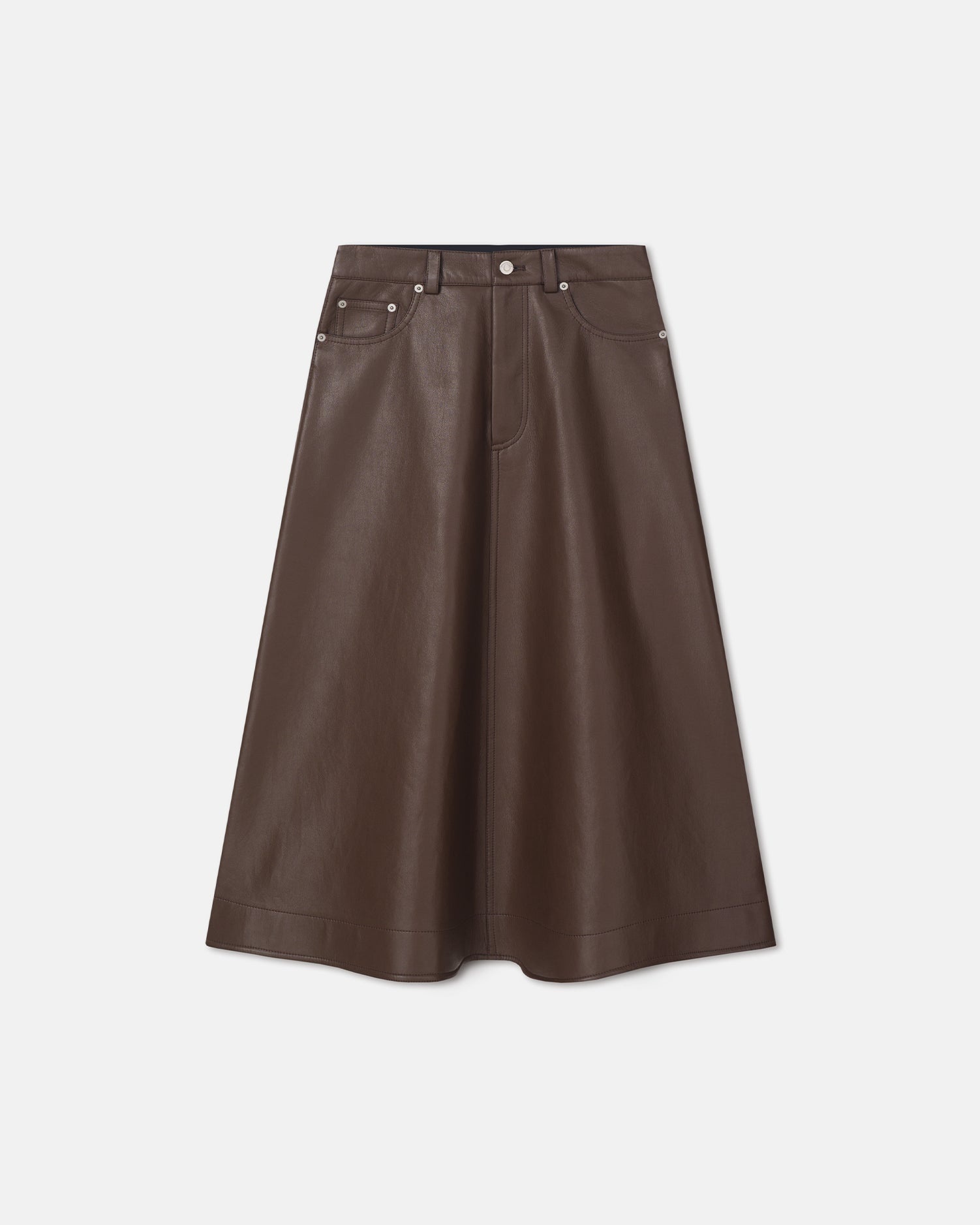 The Cintia skirt demonstrates our ethos of elevating design through conscious development. It’s made from regenerated leather – unwanted offcuts – to hold a classic A-line silhouette and detailed simply with belt loops and a five-pocket design. Fit Intentionally designed for an oversized look. Materials and Care Shell: Coating: Polyurethane Base: 100% Polyester Lining: 100% Viscose Do not wash, do not bleach, do not tumble dry, iron low heat (110°), gentle dry clean any solvent except trichloroethylene, do not wring Handle with care to ensure garment lifespan. Repair or resell to support circular fashion.