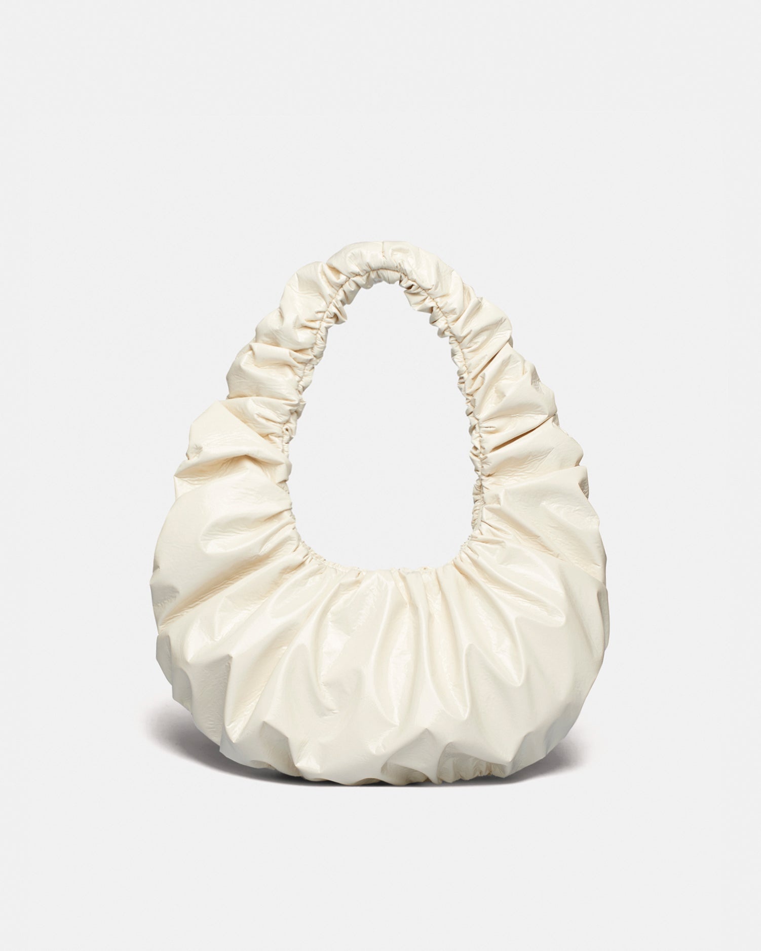 Made from our high-shine patent alt-leather, the Anja bag is tightly scrunched yet smooth to the touch. It has a curved handle that's long enough to be worn over your shoulder or in the crook of your arm. Materials and Care Body: 50% Polyester; Body 50% Polyurethane; Lining 50% Polyester; Lining 50% Polyurethane; Hardware 100% Zamak Do not bleach, do not tumble dry, dry clean any solvent except trichloroethylene, do not wash, do not iron