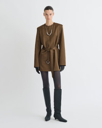 The Genaya Dress blends modern structure with understated sensuality. Crafted from brown structured satin, this crew-neck mini dress is defined by wide shoulders and a self-tie belt that shapes the waist. In a rich woody hue, it reflects quiet strength and adaptability. Fit Standard fit, matches usual sizing Model is 180 cm (5'11'') and wears a size S. Materials and Care Shell: 100% POLYESTER Lining: 100% VISCOSE Do not wash, Do not bleach, Do not tumble dry, Iron low heat (110°), Gentle Dry clean any solvent except Trichloroethylene