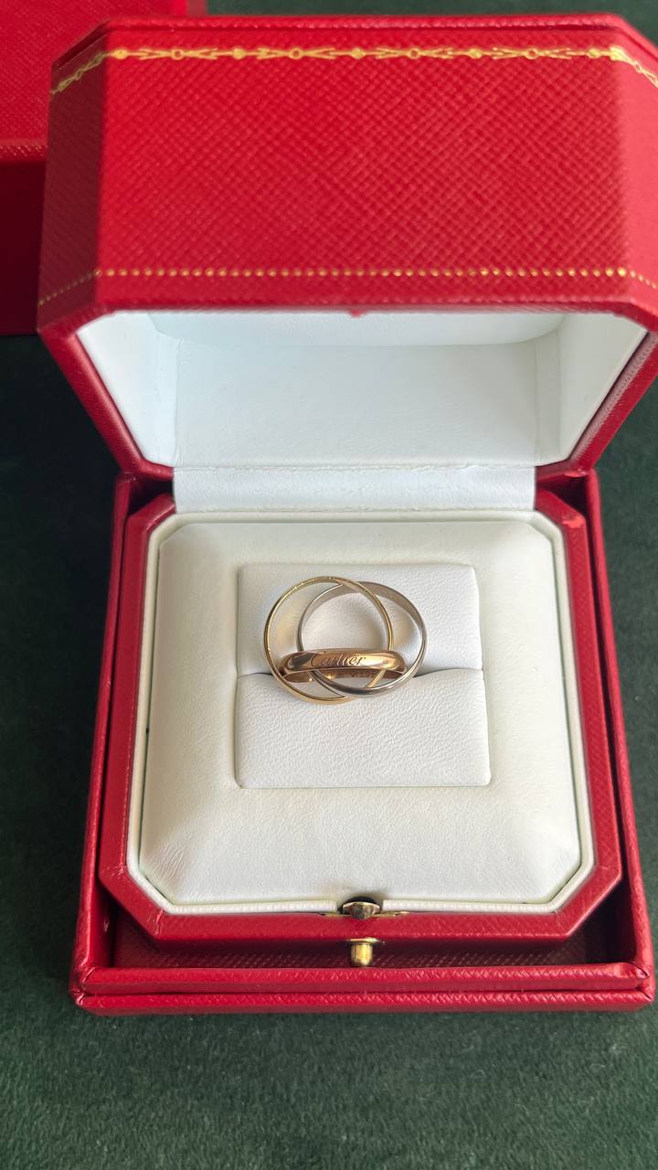 Louis Cartier, the founder's grandson, introduced the Trinity ring in 1924. The ring is characterised by its three-band construction, intertwined to create an eternity effect. The collection has since expanded to include necklaces, bracelets and earrings. Retails for 1960 USD. In excellent condition and recently polished. Ring size is 50. Comes with Box;Certificate of Authenticity;Original Receipt; Cartier Classic Trinity Ring in 18k 3 Tone Gold Listing Title: Cartier Classic Trinity Ring in 18k 3 Tone Gold