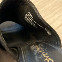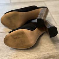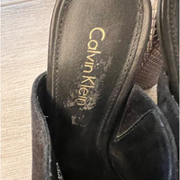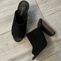 Brand: Calvin Klein Size: 5.5 Condition: worn once, in great condition. The right mule does have sticker residue. Color: black suede with metallic bronze gold heel. 4 inch heel.