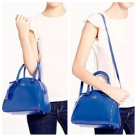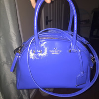 Like new!! Worn a couple of times. Comes with dustbag, measures approximately 8''h x 11''w x 4.5''d. Patent leather with matching trim, 14-karat light gold plated hardware, the color is orbit blue.