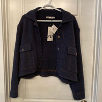 Brand: Zara Condition: New with tags Size: cardigan is a size small and the skirt is also small. Color: dark blue with brown stitching. Details: Nice thick material. Button down cardigan, pull on skirt.