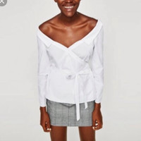 Brand: Zara Condition: worn and washed once, a little wrinkled from being in my closet. Size: XSmall Crossover white shirt, with tie detail.
