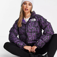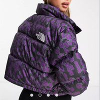 Brand: The North Face Condition: New without tag, never been worn. Size:XSMALL Color: black with purple leopard print. Cropped length, drawstring waist, 700 fill.
