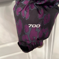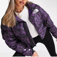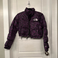Brand: The North Face Condition: New without tag, never been worn. Size:XSMALL Color: black with purple leopard print. Cropped length, drawstring waist, 700 fill.
