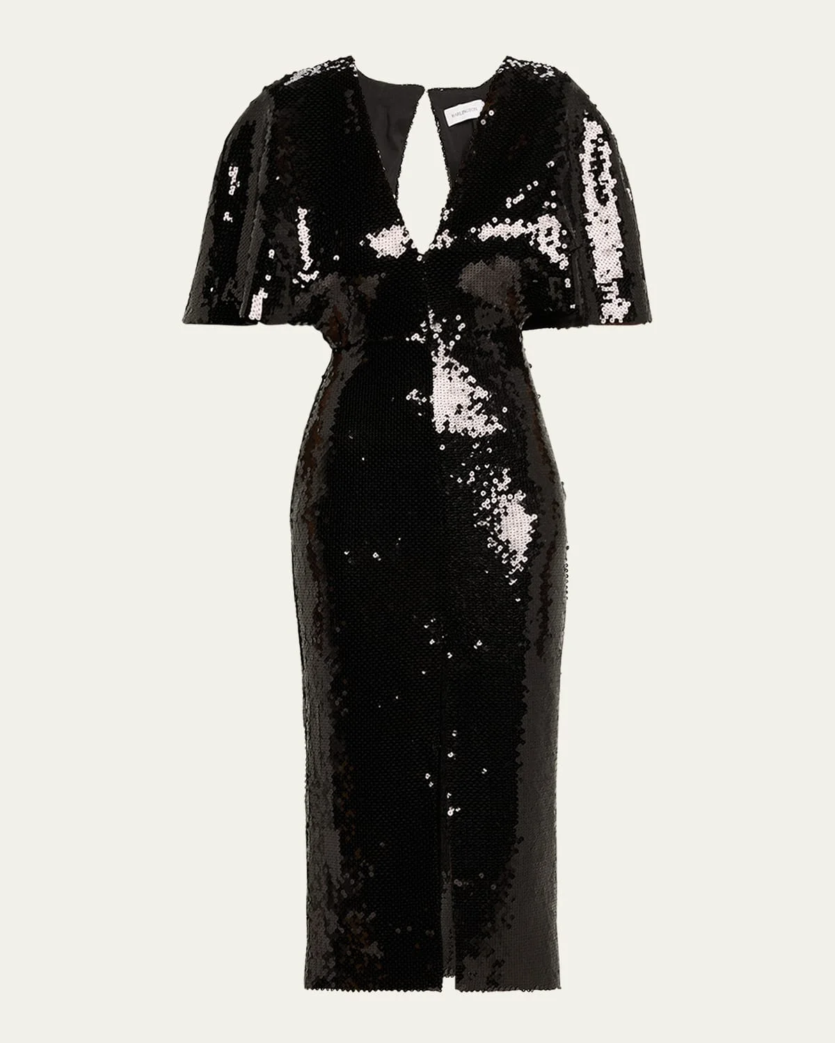 16ARLINGTON's "Ermara" sequinembellished dress is framed with structured batwing sleeves that create volume through the upper body V neckline Elbowlength sleeves Centercut front slit Triangular back cutout Hem falls below the knee Sheath silhouette Back hookandeye closure Polyester Made in United Kingdom