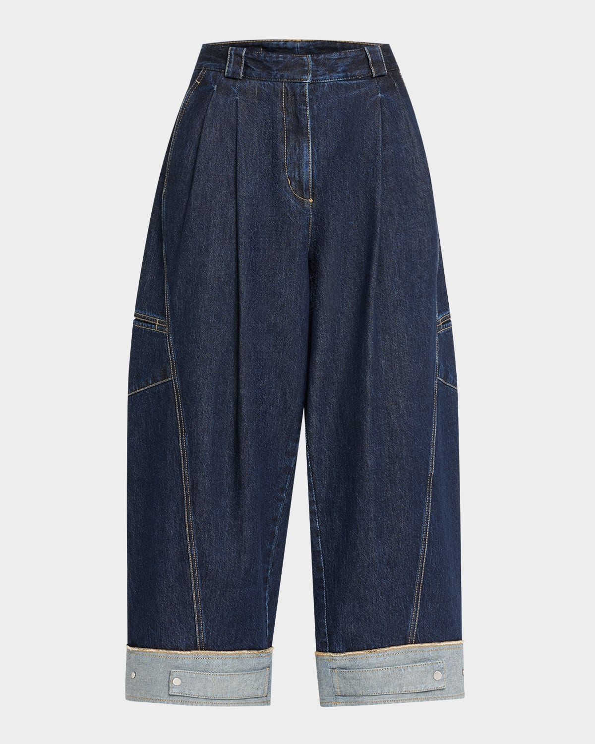 - 3.1 Phillip Lim curved wide-leg jeans featuring a contrast hem with adjustable button tabs - High rise - Pleated front - Four-pocket style - Loose fit - Cropped length - Snap/zip fly; belt loops - Cotton - Imported