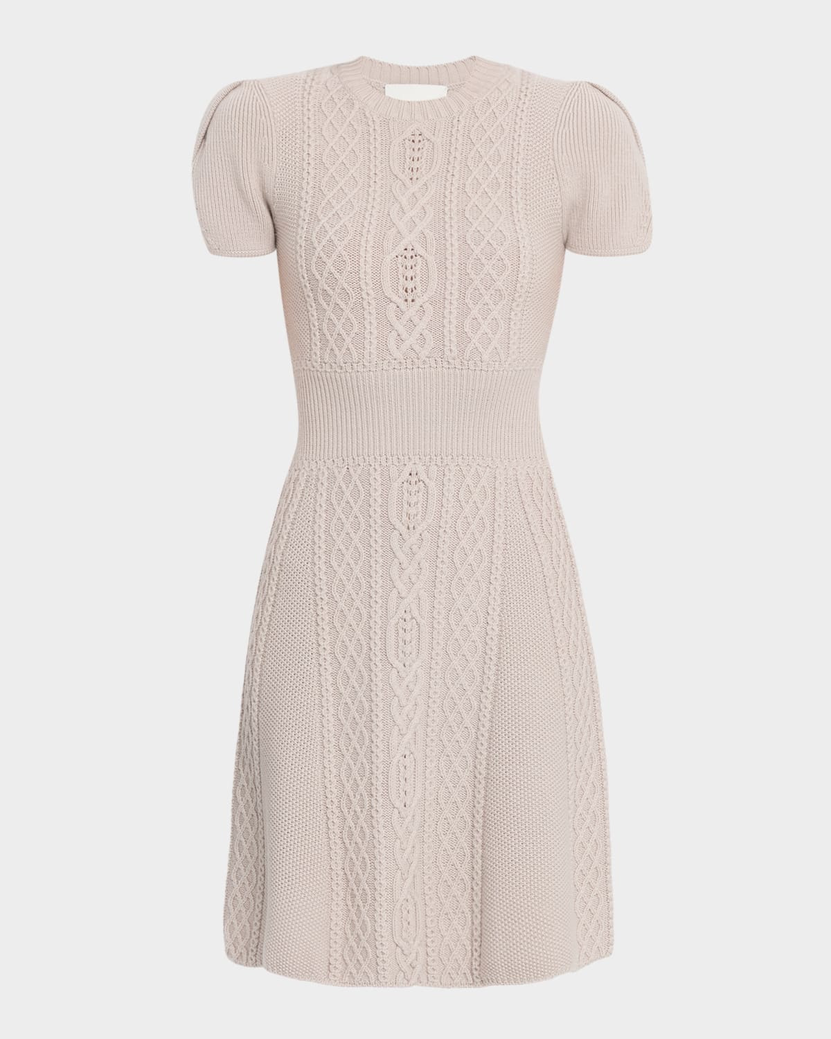Cableknit wool mini dress by 3.1 Phillip Lim. Mock neckline Short tulip sleeves Aline silhouette Hem falls below the knee Slipover style Wool Dry clean Imported