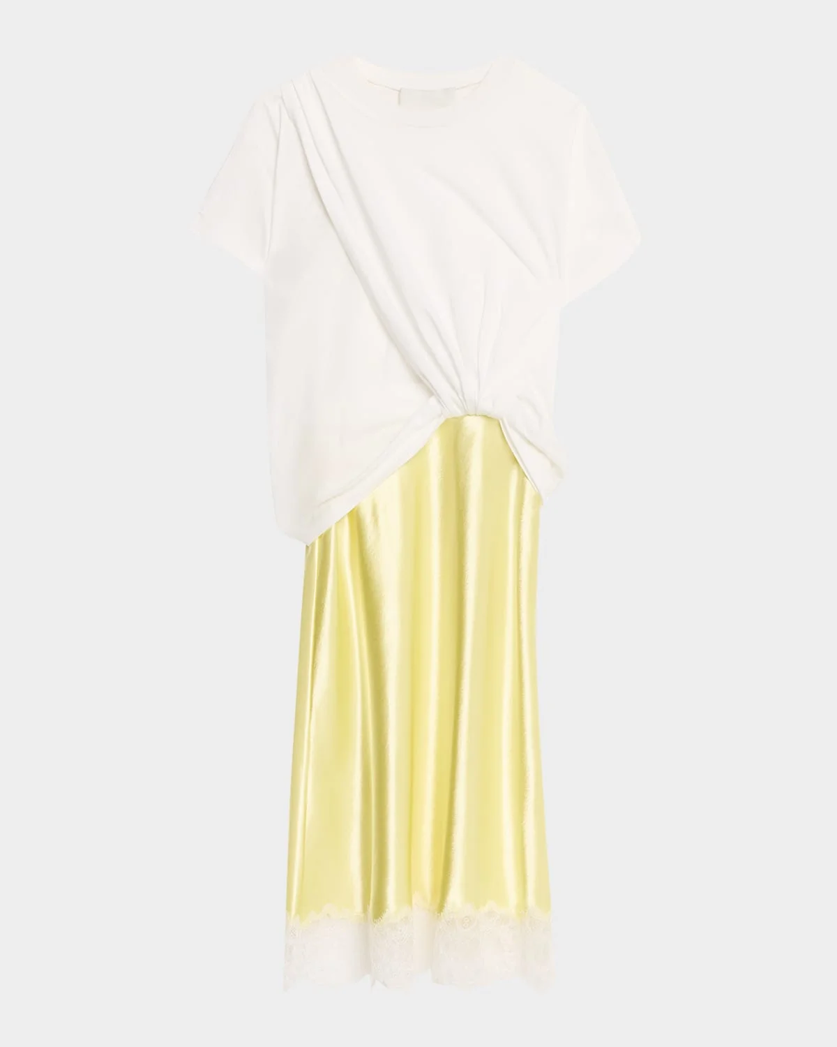 Designed with an elevated combo silhouette, this 3.1 Phillip Lim midi dress boasts a t-shirt style bodice that flows into a luxe satin & nbsp;slip skirt. Crew neckline Short sleeves Slip silhouette Hem falls below the knee Slipover style & nbsp; Cotton/polyester Professional cleaning recommended Trim: Lace Imported