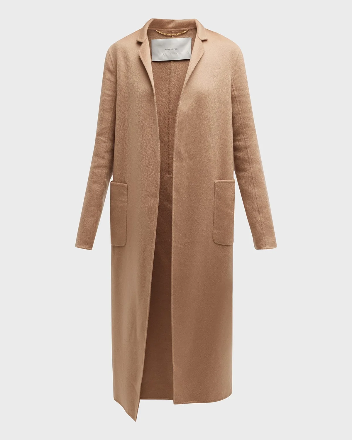 Adam Lippes "Zibelline" menswearstyle coat featuring cashmere throughout Notched collar; open front Long sleeves Oversize patch pockets at sides Midi length Relaxed fit Cashmere Made in the USA