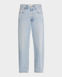 AGOLDE wideleg jeans in lightwash denim Approx. measurements: 11.8" rise; 31" inseam Midrise; sits high on the hip Fivepocket style Subtle, tapered fit Full length Button/zip fly; belt loops Cotton Imported