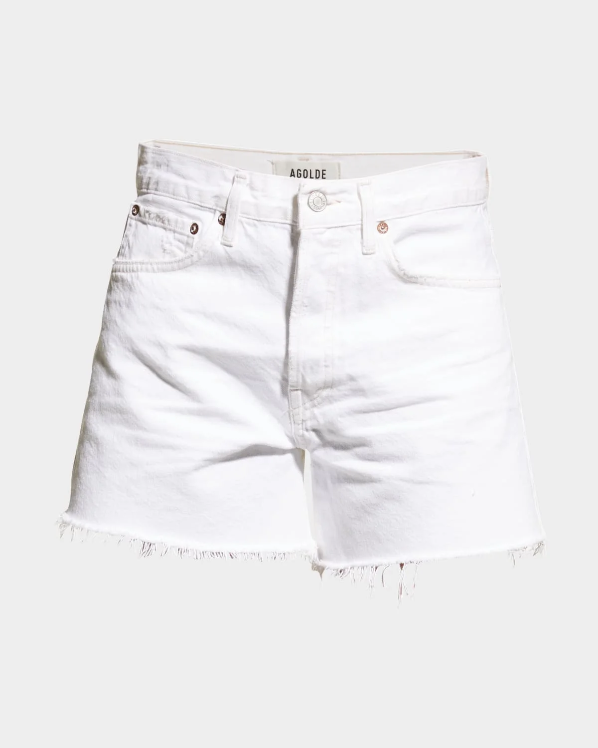 AGOLDE "Parker" shorts in distressed white denim. Midrise waist. Fivepocket style. Relaxed fit. Frayed rawedge hem. Button fly; belt loops. Machine wash. Cotton. Imported.