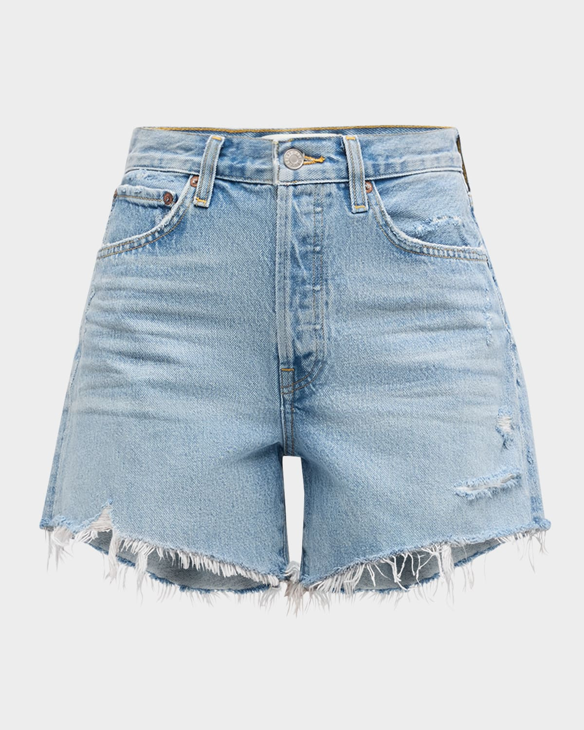 - AGOLDE "Parker" shorts in distressed light-wash denim. - Mid-rise waist. - Five-pocket style. - Relaxed fit. - Frayed raw-edge hem. - Button/zip fly; belt loops. - Machine wash. - Cotton. - Imported. - Size Note: Height: 5'10"/ waist 24”/ hips 34"/ bust 32" - Model is wearing size 26
