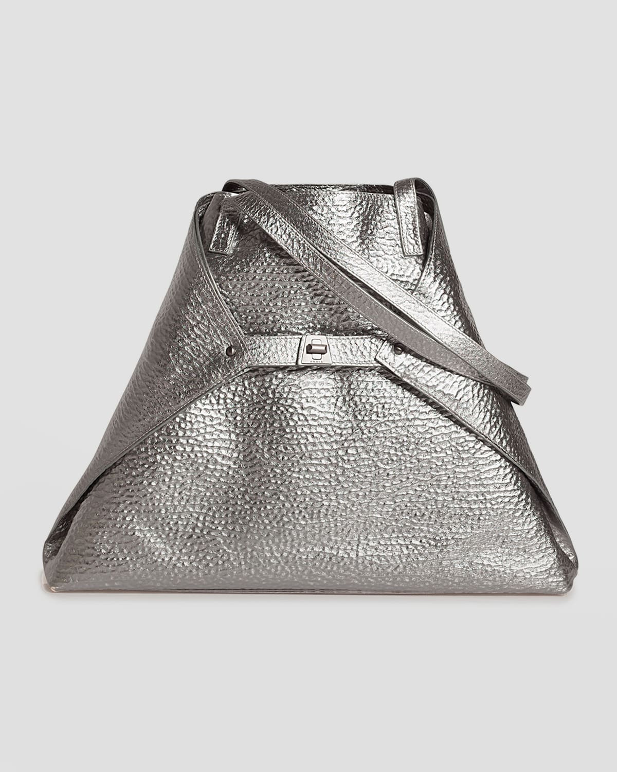 - Akris metallic shoulder bag in hammered leather. - Approx. 18.50"H x 12.20"W x 5.12"D; 11.42" drop. - Two flat shoulder straps. - Open top. - Folded sides secure at turn-lock front. - Interior, two zip pockets. - "AI" is imported.