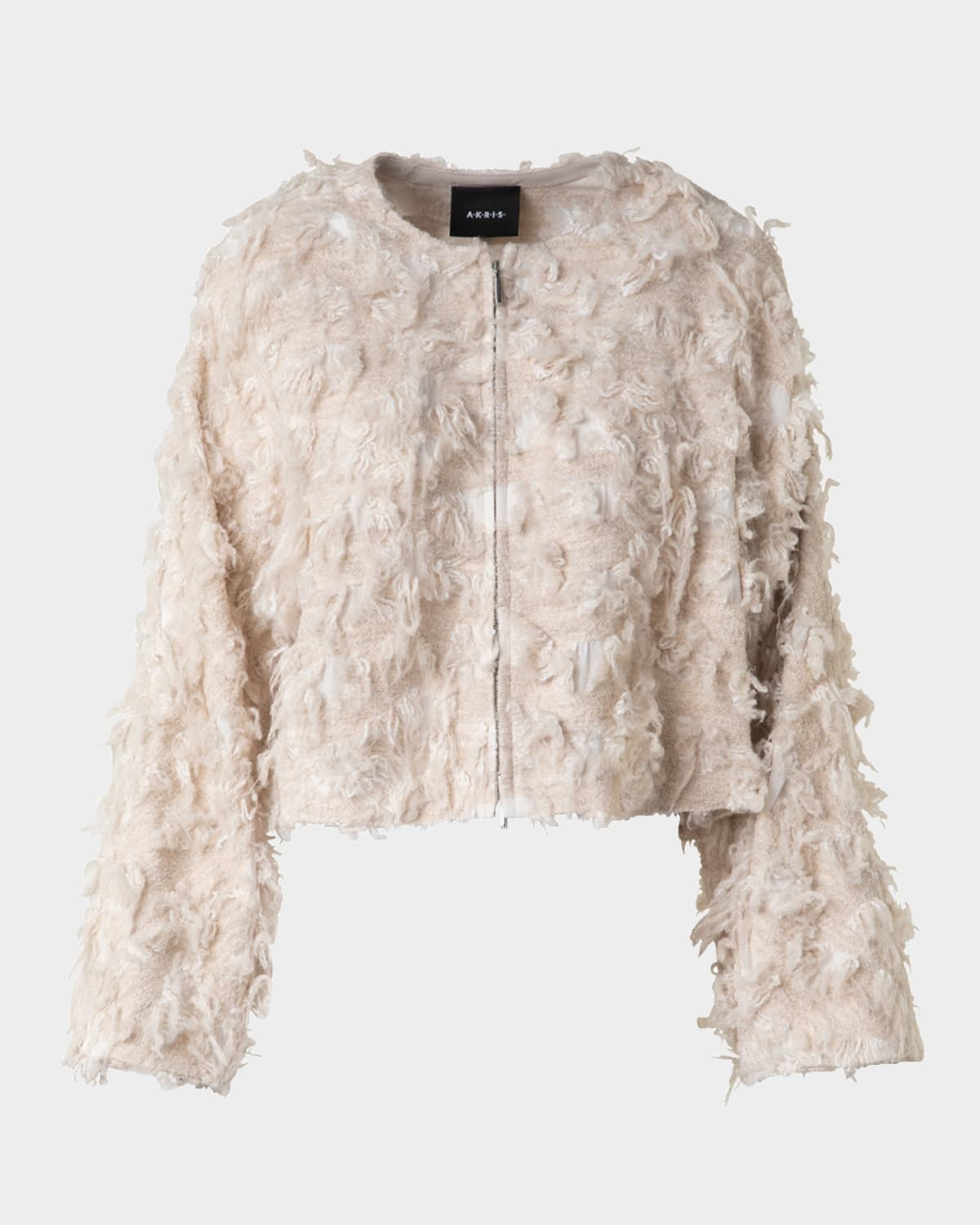 Akris "Alida" 3D jacquard jacket Round neckline; zip front Long kimono sleeves Short length Acrylic/viscose/wool Dry clean Made in Romania