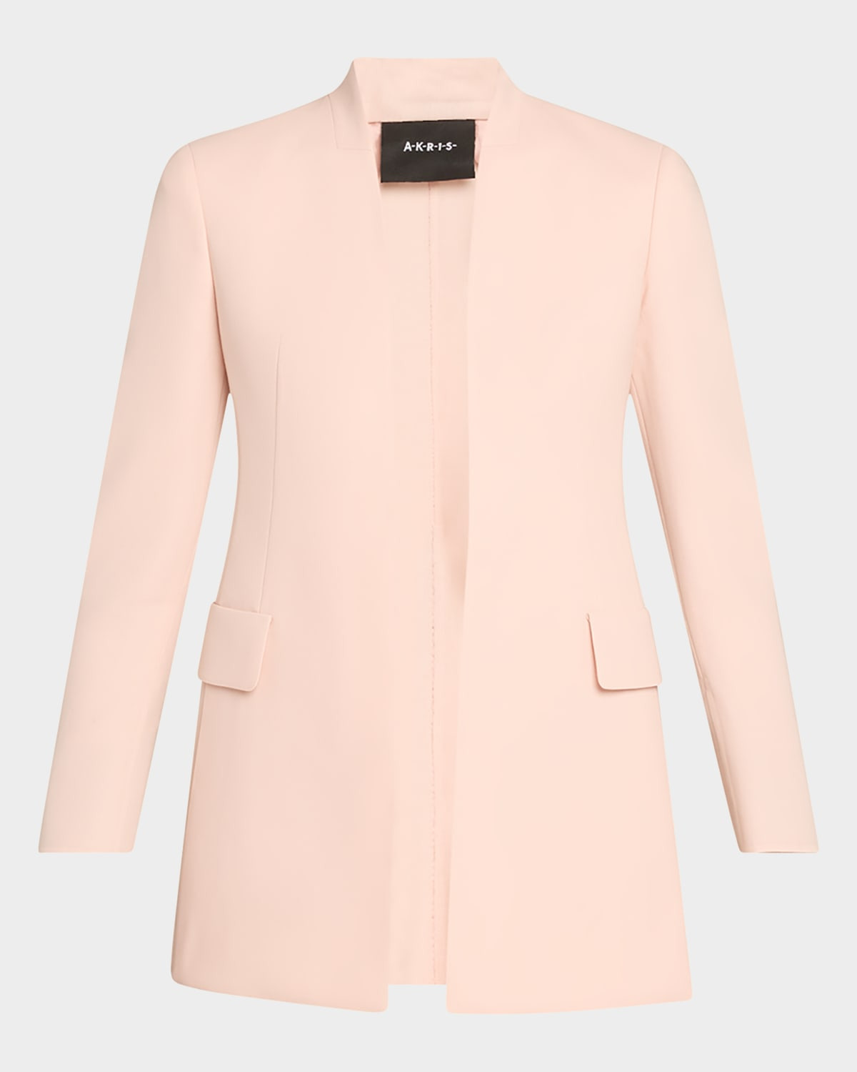 - Akris "Alvar" double-face wool cardigan-style jacket - Open front (no closure) - Long sleeves; split cuffs - Front flap pockets - Longline silhouette - Wool/nylon/polyamide - Dry clean - Made in Romania