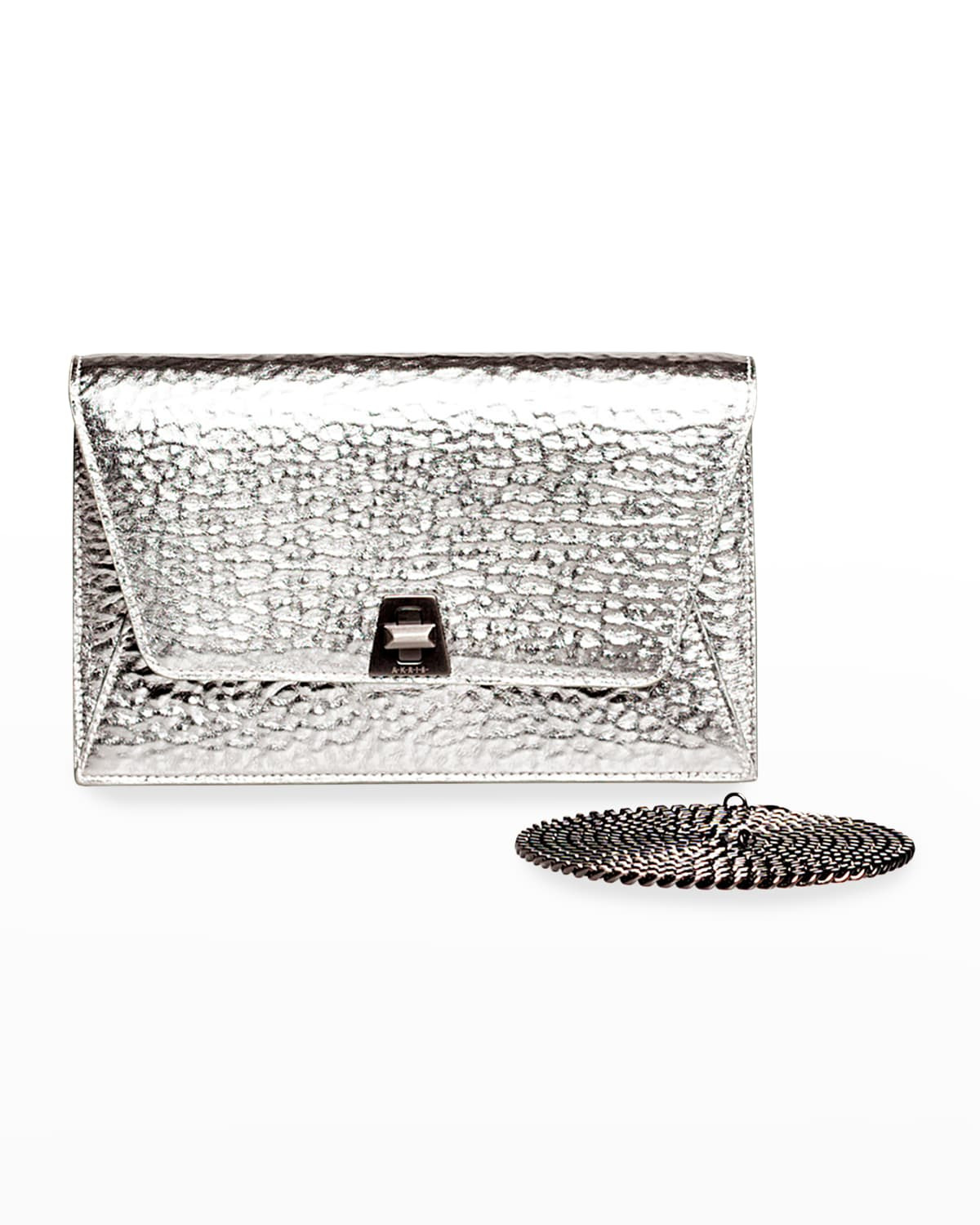 - Akris hammered metallic leather clutch bag. - Detachable chain shoulder strap. - Signature trapezoidal shape. - Turn-lock detail on flap front. - Approx. 4.5"H x 7.5"W x 1.6"D.