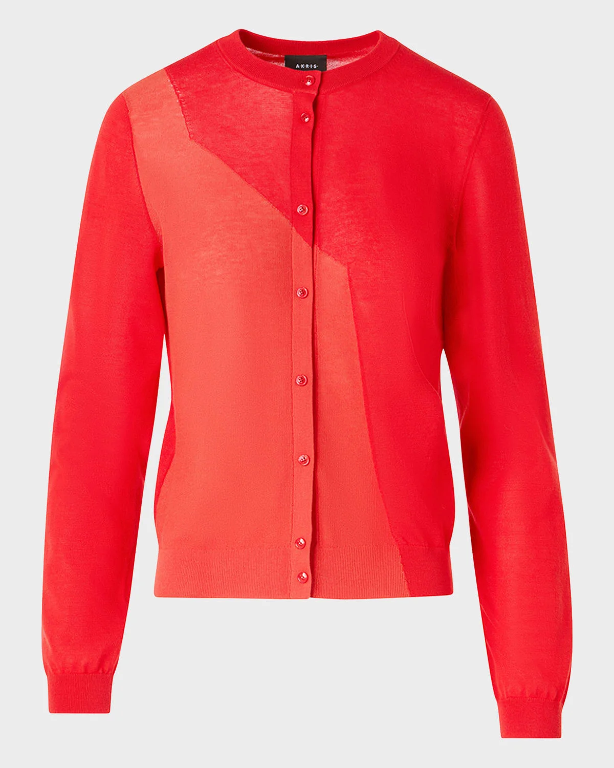 This cardigan by Akris is crafted from a silk-blend in a two-tone design Crew neckline Long sleeves Relaxed fit Hip length Button front closure Cotton/nylon/polyamide/silk Dry clean Made in Romania