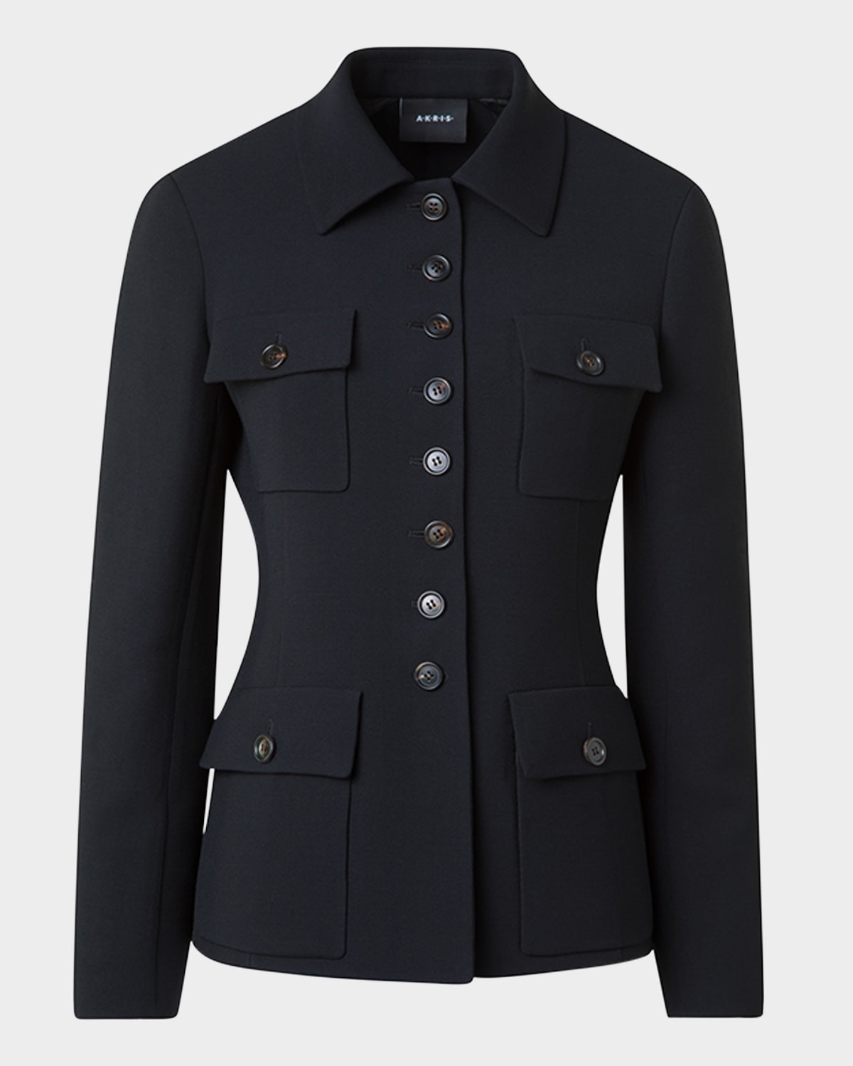 - Akris "Delia" jacket in double-face wool - Point collar; single-breasted front - Long sleeves; slit cuffs - Padded shoulders - Front button-flap pockets - Slim fit - Center-back vented hem - Virgin wool - Lining: Cupro - Dry clean - Made in Switzerland