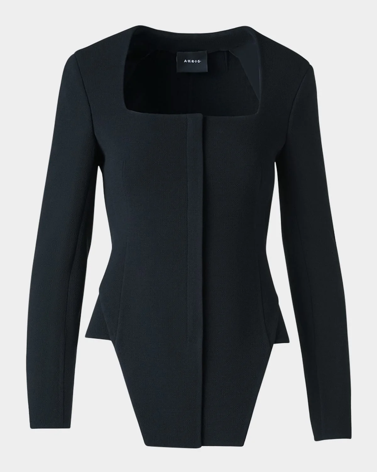 - Akris "Desiree" double-face wool trapezoid jacket - Square neckline - Long sleeves - Fitted - High-low hem - Concealed front zip - Wool/elastane - Lining: Elastane/silk - Dry clean - Imported