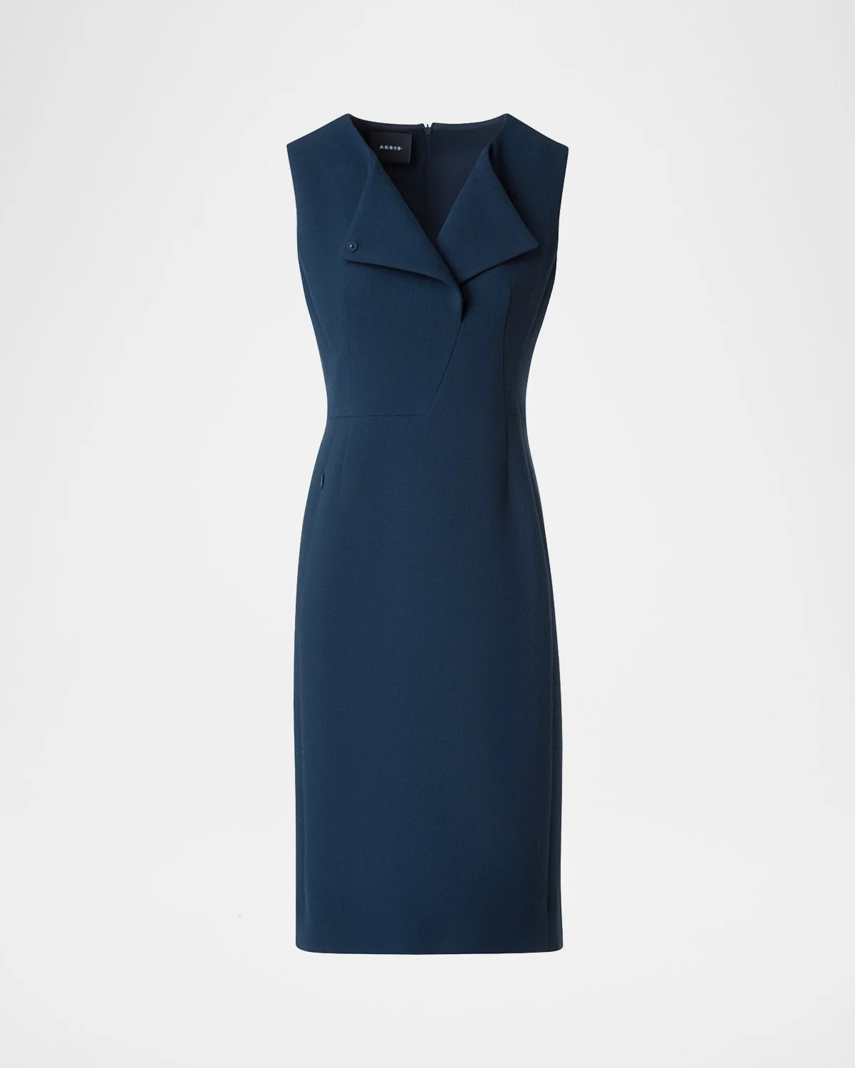 - Akris double-face wool crepe dress adorned with asymmetrical front detail - Crew neckline - Sleeveless - Hem falls below the knee - Sheath silhouette - Invisible back zipper - Virgin wool - Lining: Viscose/silk - Dry clean - Made in Switzerland
