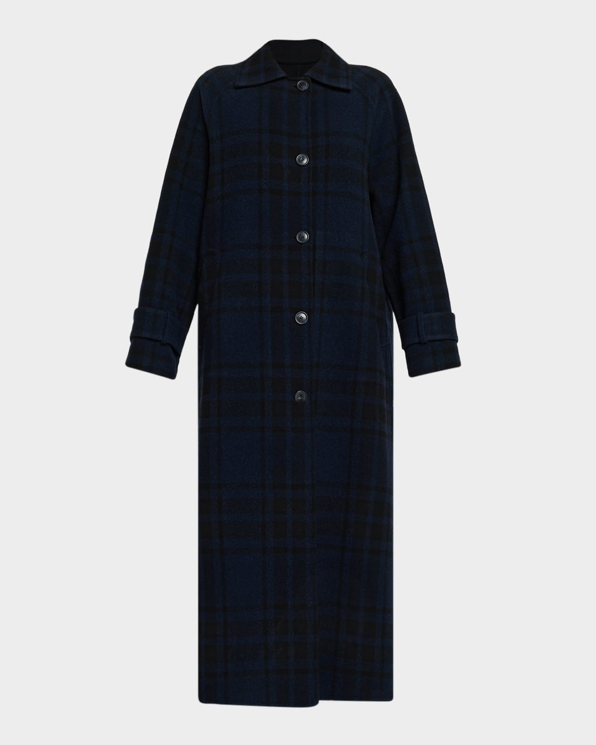 - Akris "Estelle" double-face wool maxi coat in tonal check - Point collar - Single-breasted front - Long raglan sleeves with belted cuffs - Angled side pockets - Relaxed fit - Walking vent - Button-front - Virgin wool - Lining: Cupro - Dry clean - Imported