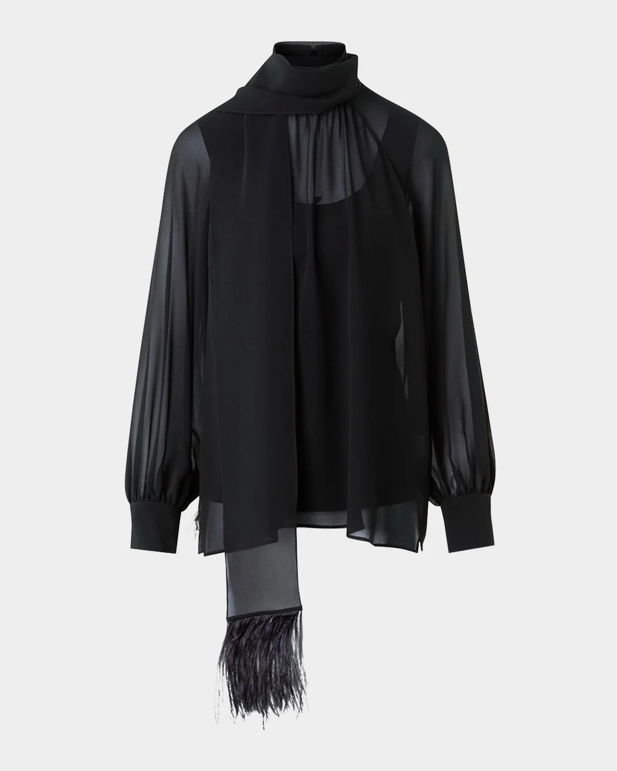 - Akris silk georgette blouse featuring an attached scarf with ostrich feather trim - Band collar - Long sleeves; button cuffs - Loose fit - Back zip - Silk/feather/polyester - Lining: Viscose - Dry clean - Made in Switzerland