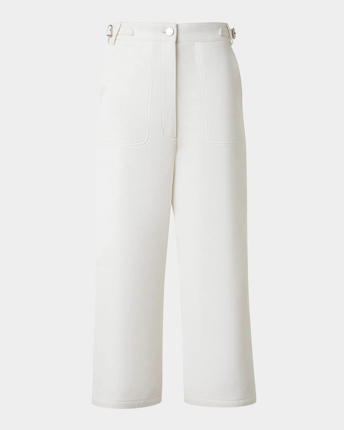 Akris "Finn" Bermuda shorts in stretch denim with adjustable side straps High rise Cropped fit Straight legs Side slip pockets; back patch pocket Button/zip fly Cotton/polyurethane Made in Portugal