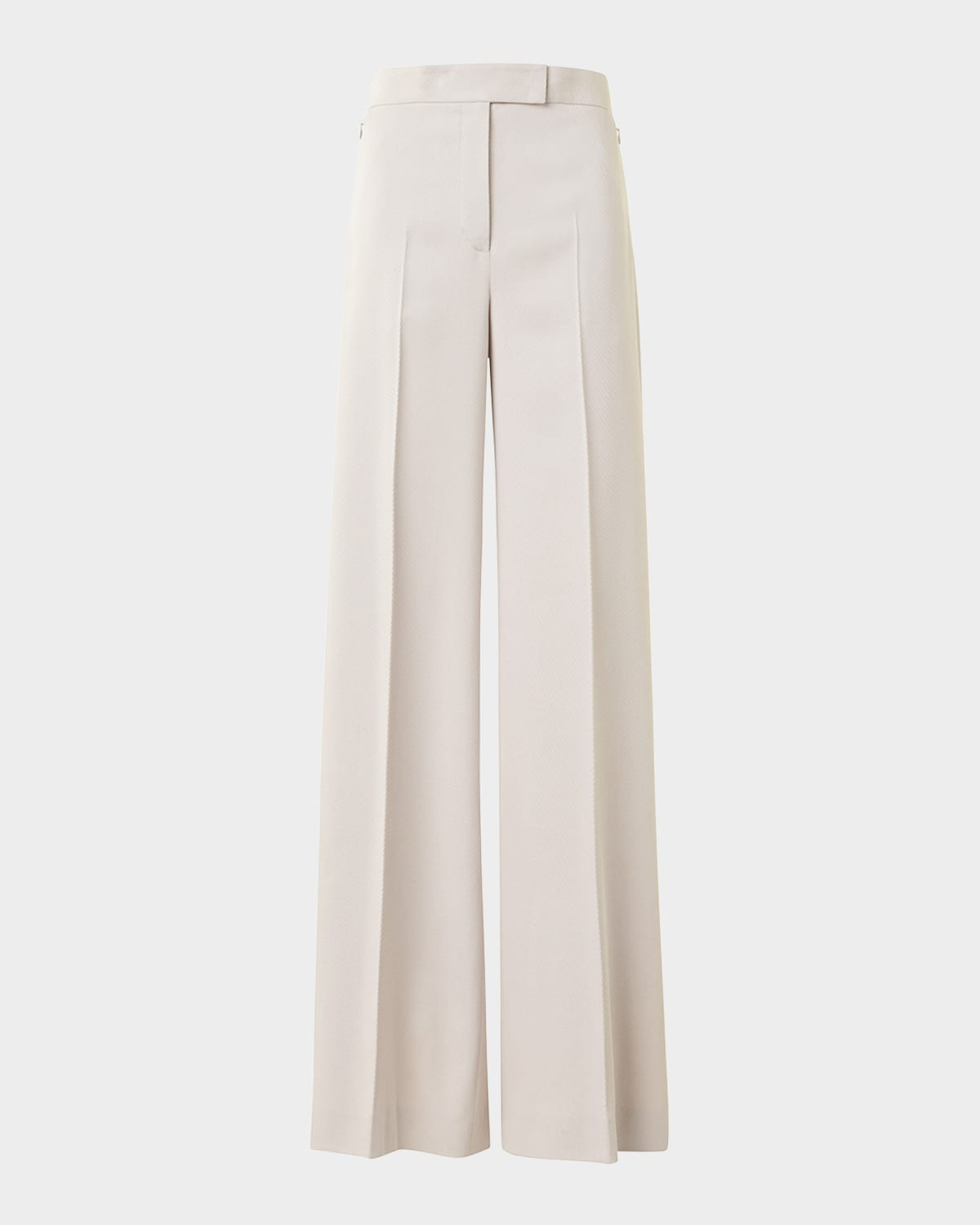 - Akris "Floretta" pants in silk-blend twill - High rise - Flat front - Invisible side zip pockets - Wide legs - Full length - Hook-tab/zip fly - Silk/wool - Made in Romania