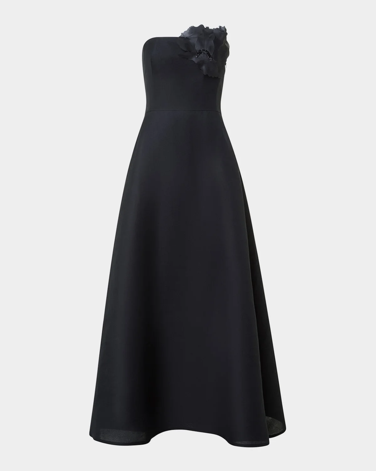 - Akris silk organza gown embellished with a 3D flower corsage - Strapless neckline - Sleeveless - A-line silhouette - Full length - Invisible side zip - Silk - Lining: Viscose/silk - Dry clean - Made in Romania