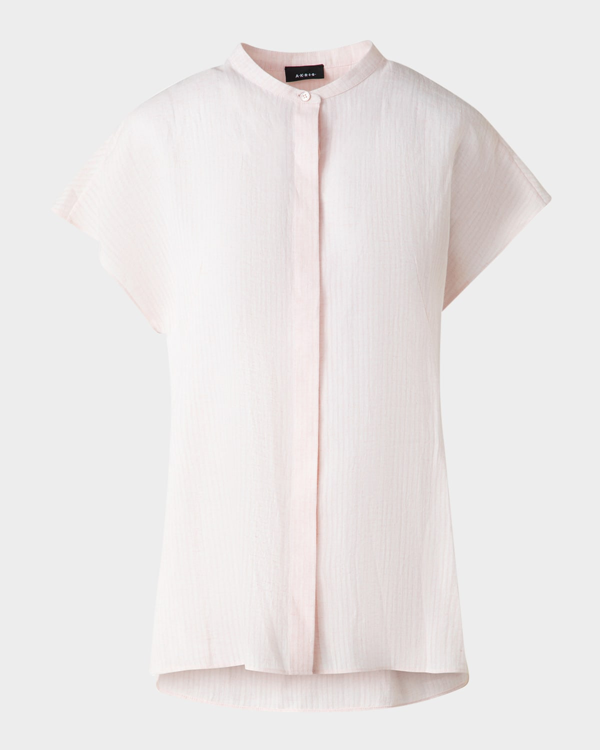 Akris blouse crafted from linen voile Stand collar Cap sleeves Side slits Hip length Shirttail hem Concealed button front Linen Dry clean Made in Romania