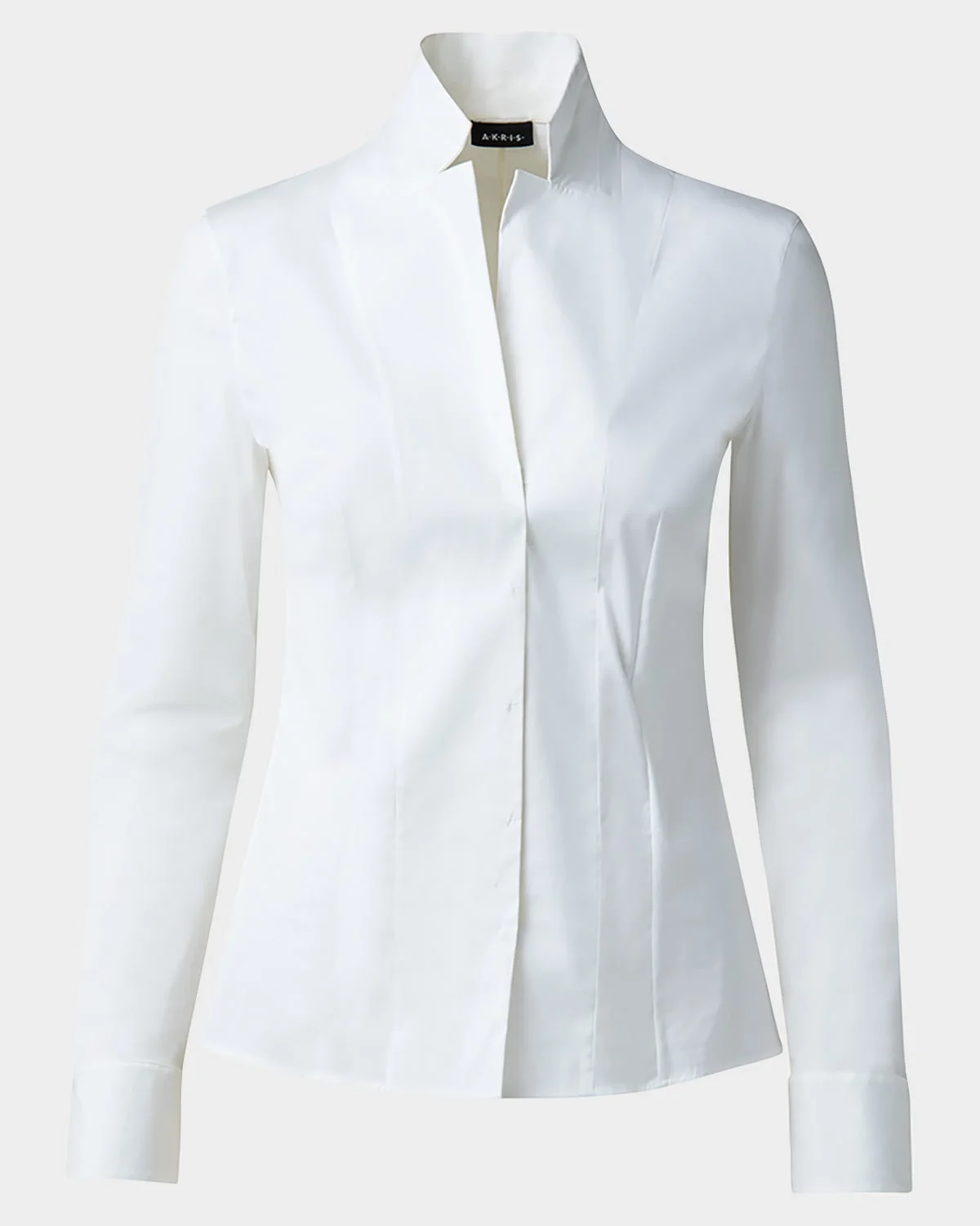 Poplin with tonal princess seaming for slim fit. Approx. 24"L down center back. Notched stand collar; concealed front closure. Long sleeves; barrel cuffs. Straight hem. Cotton/nylon/spandex. Dry clean. Made in Romania.