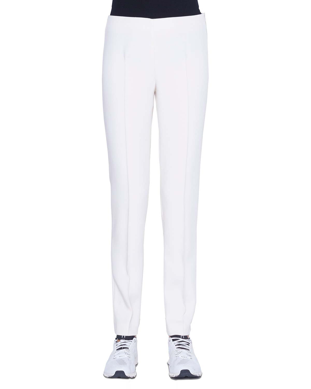 Akris "Melissa" stretchwoven pants. Rise sits below the natural waist. Slimfit legs; full length. Front and back center crease. Hidden side zip. Silk/spandex. Imported.