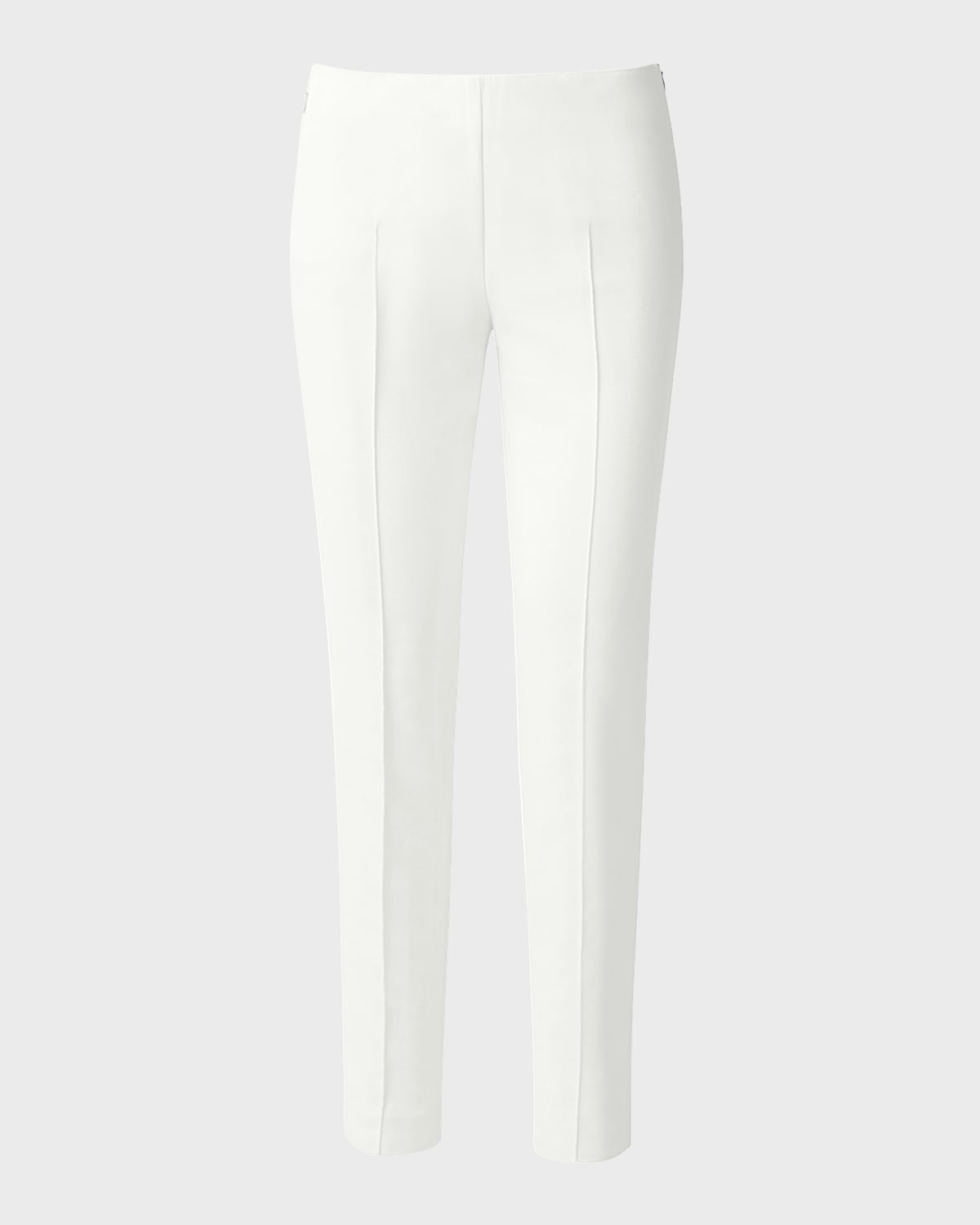 Akris "Melissa" pants in cotton tech. Approx. measurements: 10" rise, 30.5" inseam, 39" outseam; 12" leg opening. Low rise. Seam details at front and back. Slim fit through skinny leg. Side zip closure. Cotton/nylon/spandex. Imported.