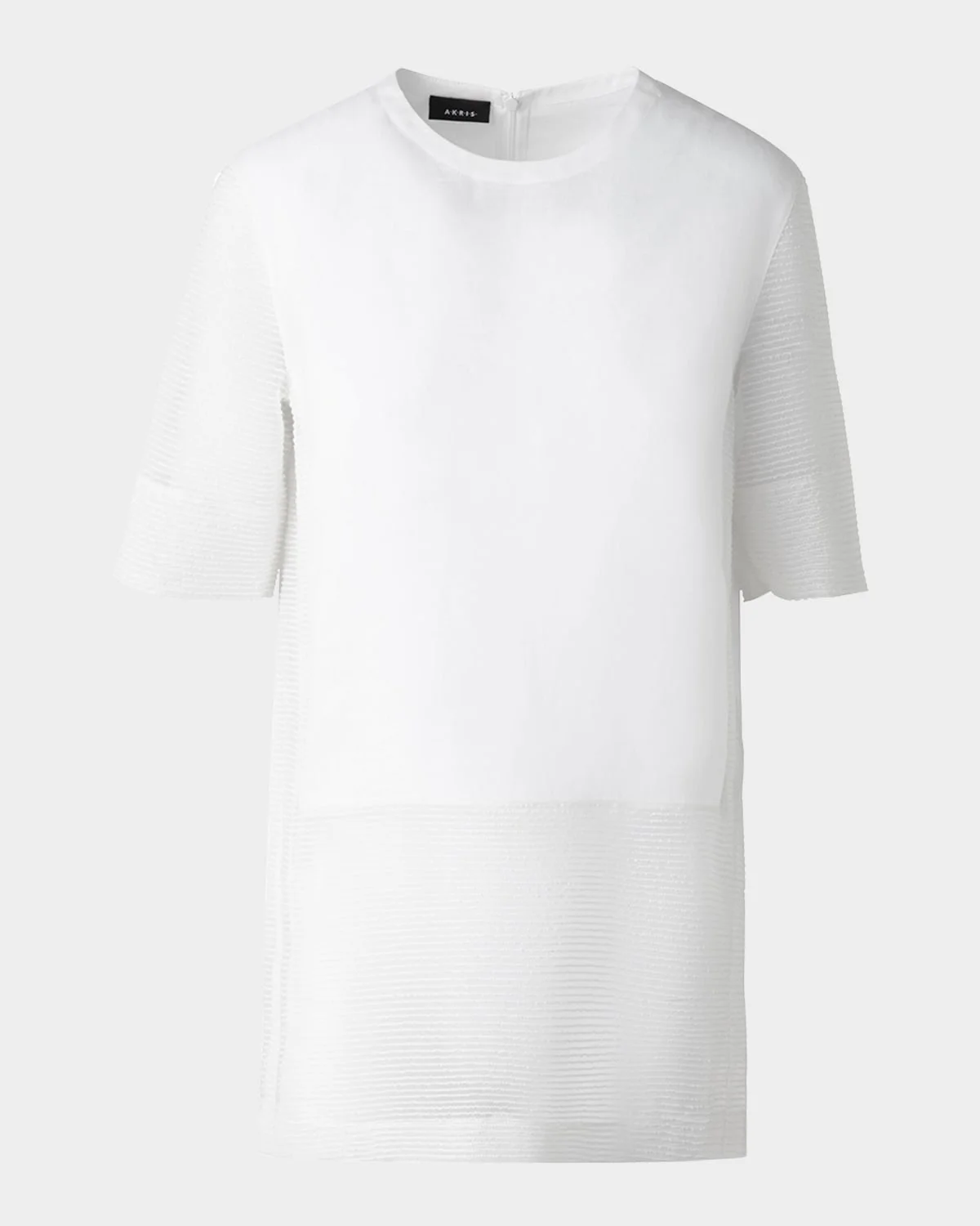 Akris blouse in linen toile and boucle striped organza combo Crew neckline Short sleeves Loose fit Tunic length Side slits Invisible back zip Linen Made in Switzerland