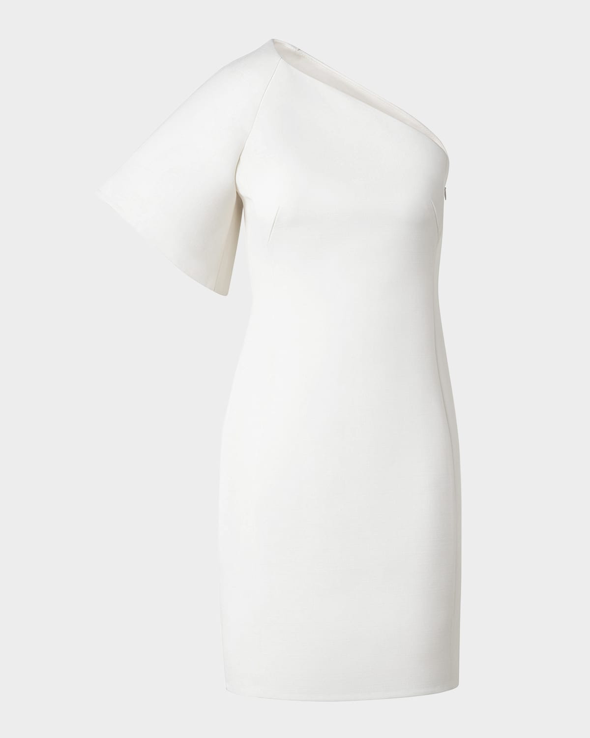 Akris structured doubleface wool dress with a volume sleeve Oneshoulder neckline Elbow sleeve Sheath silhouette Midthigh length Invisible side zip Virgin wool/nylon/polyamide/silk Made in Switzerland