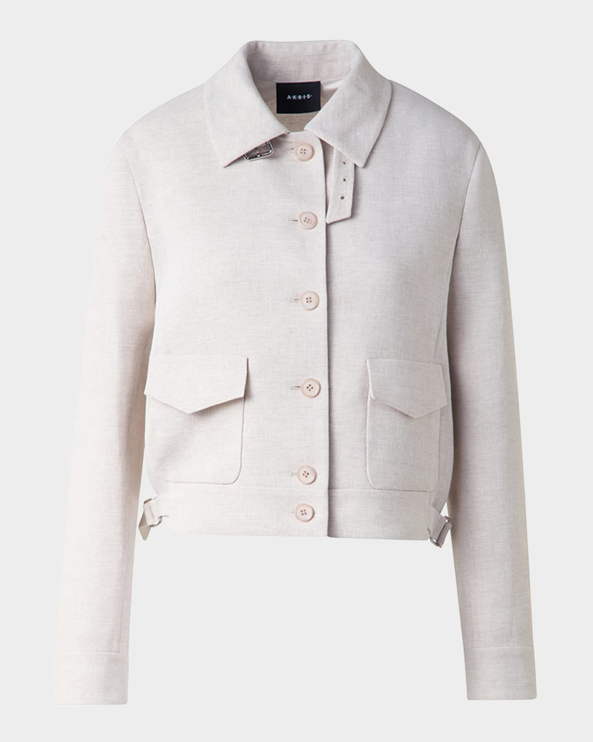 - Akris "Peer" jacket crafted from twisted double-face linen - Shirt collar - Long sleeves - Front patch pockets - Hip length - Front button closure - Linen/cotton - Made in Switzerland