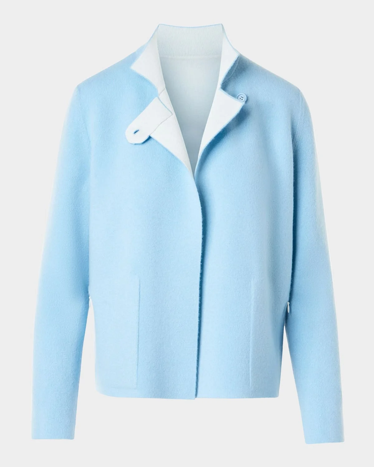 Akris reversible jacket is knit in bicolor soft cashmere Stand collar; button throat latch Long sleeves Side zip pockets Boxy fit Hip length Cashmere Made in Romania