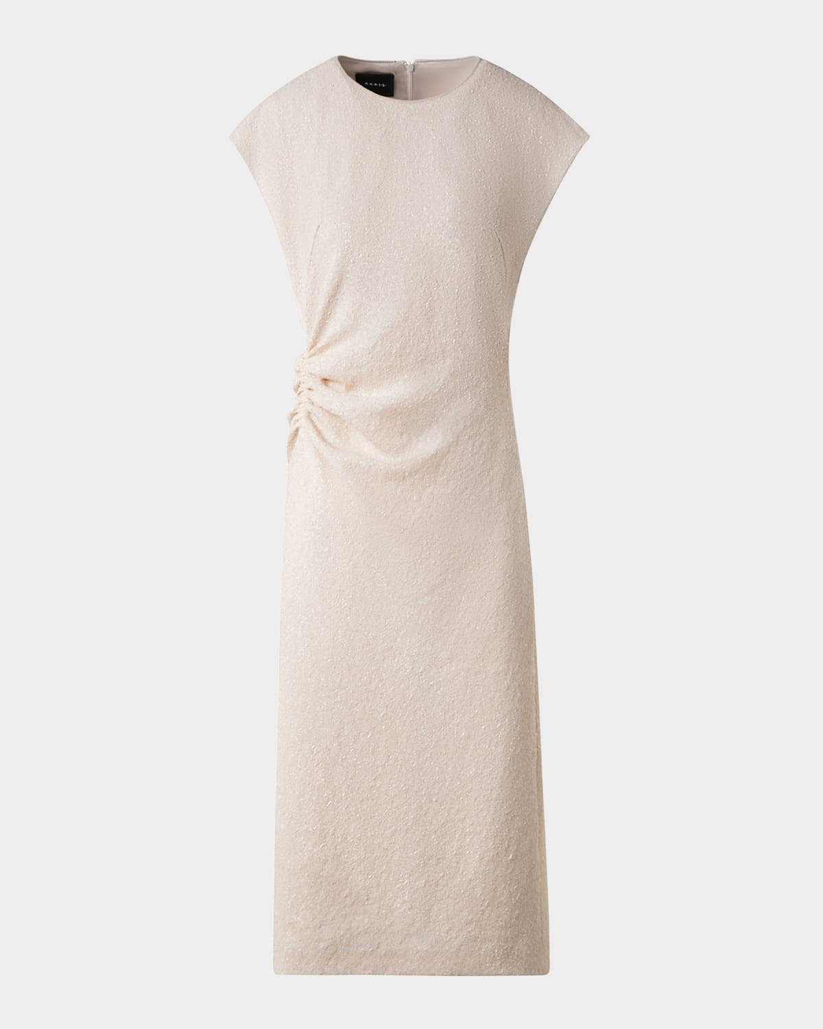 Akris dress in micro sequined stretch jersey with a ruched side detail Round neckline Cap sleeves Sheath silhouette Knee length Invisible back zip Polyester/elastane Made in Switzerland