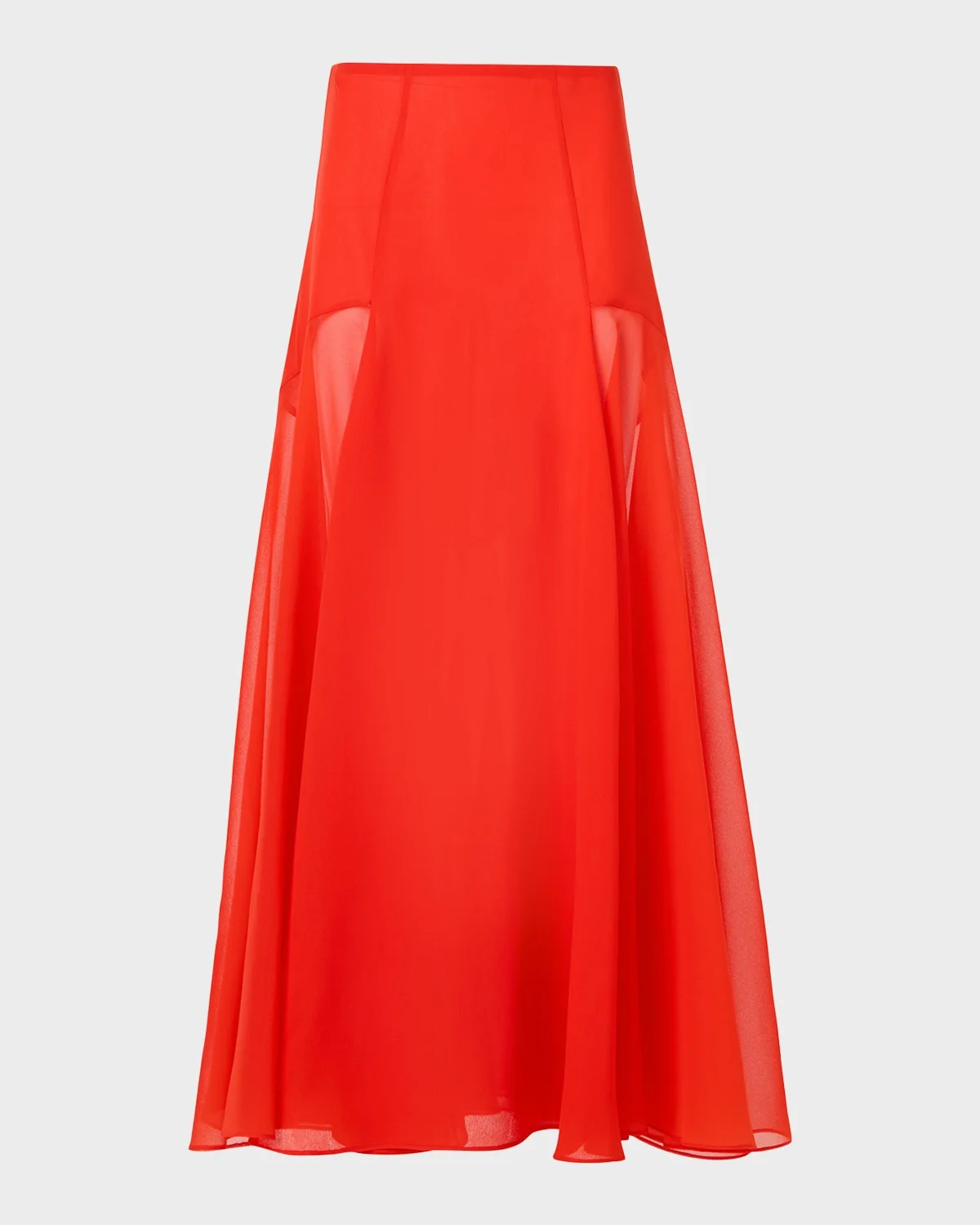 Crafted from semi-transparent Panama silk organza, this skirt & nbsp;from Akris features a flare godet for feminine movement High waist A-line silhouette Hem falls below the knee Invisible back zip Silk Dry clean Made in Romania