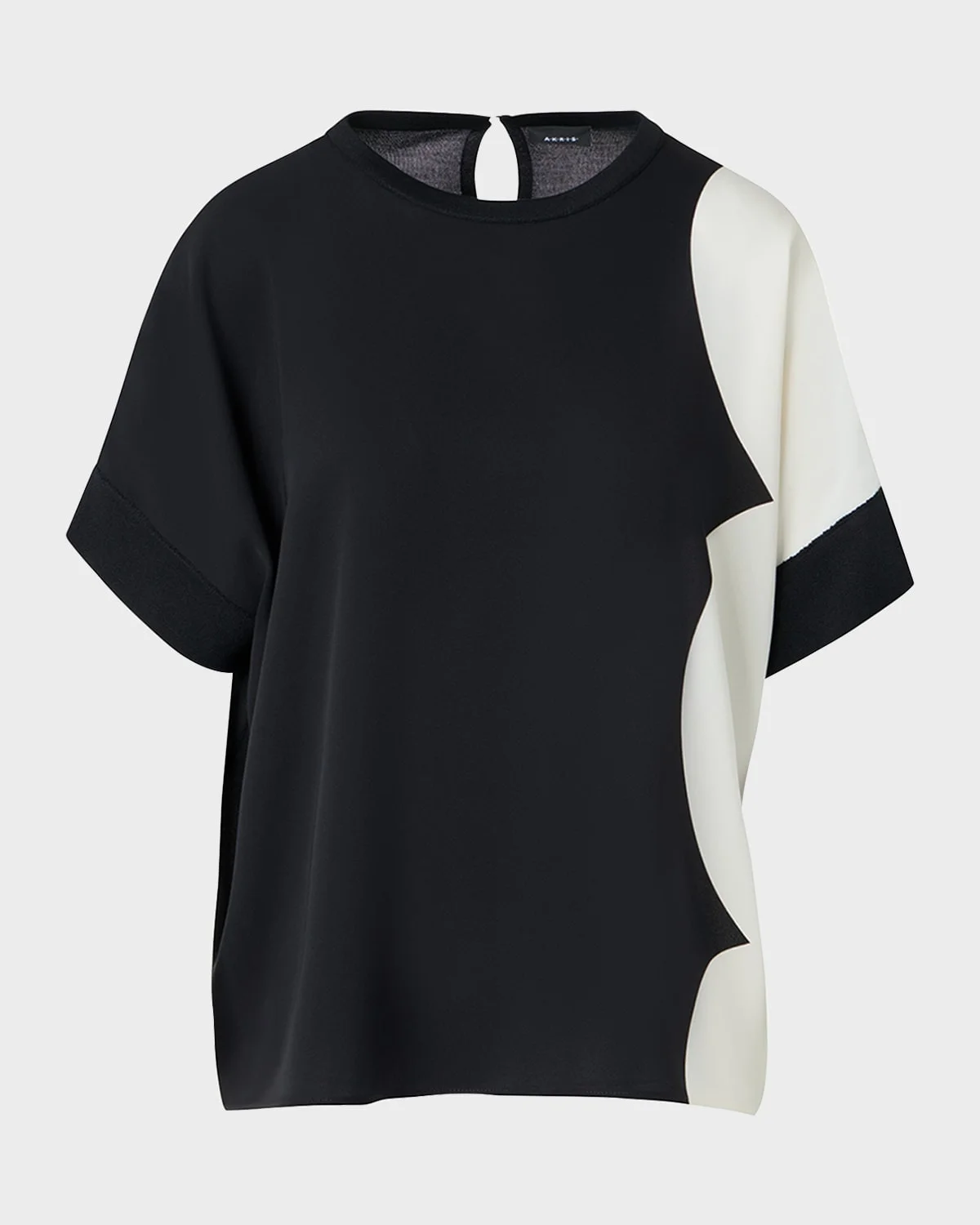 Crafted from lightweight silk knit, this sweater from Akris features an abstract printed fluid silk front panel Crew neckline; button/keyhole back Short sleeves; ribbed cuffs Loose fit Hip length Pullover style Silk Lining: Silk Dry clean Made in Romania