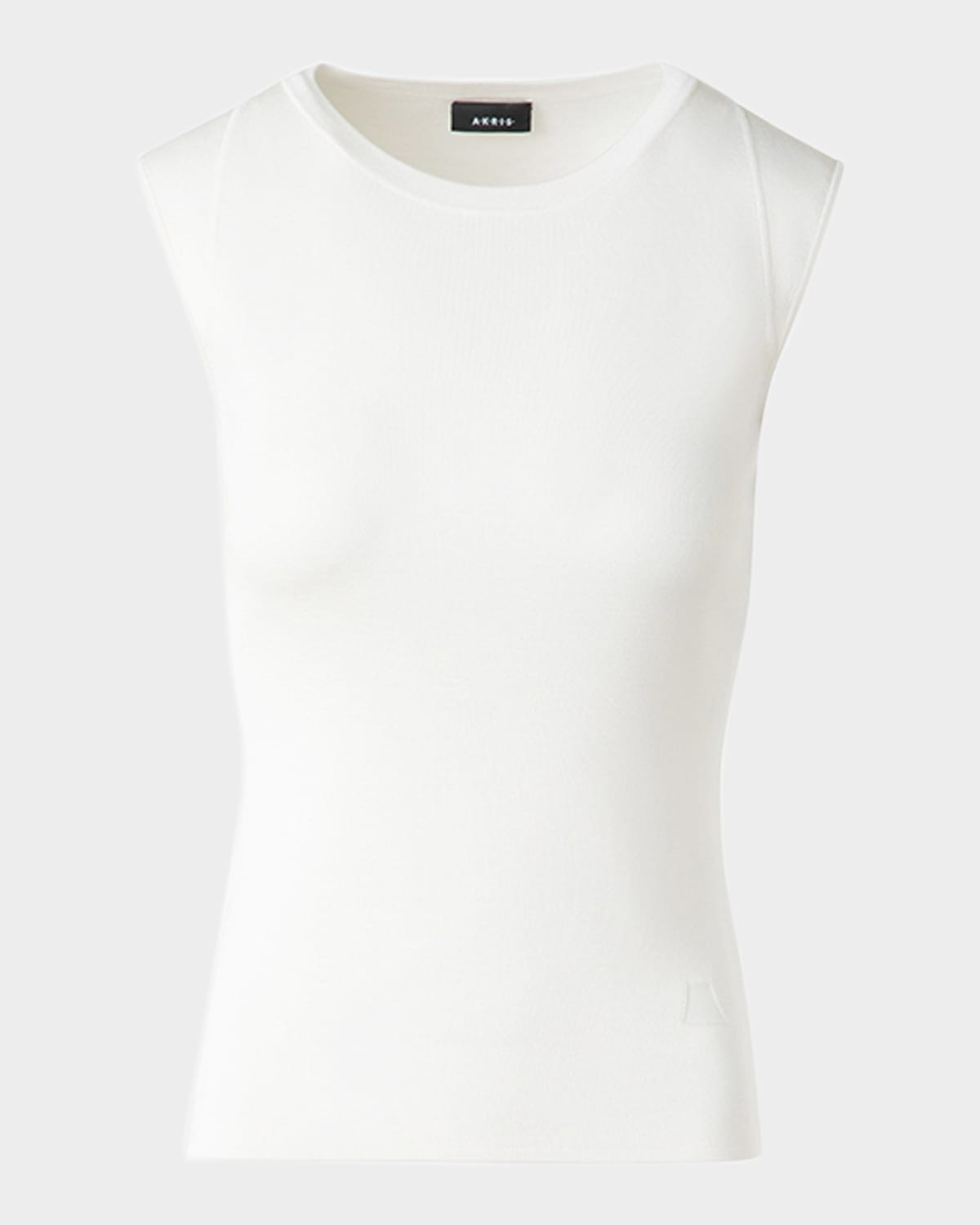 Akris stretchy knit top defined by a streamlined silhouette Crew neckline Sleeveless Hip length Fitted Pullover style Silk Made in Romania