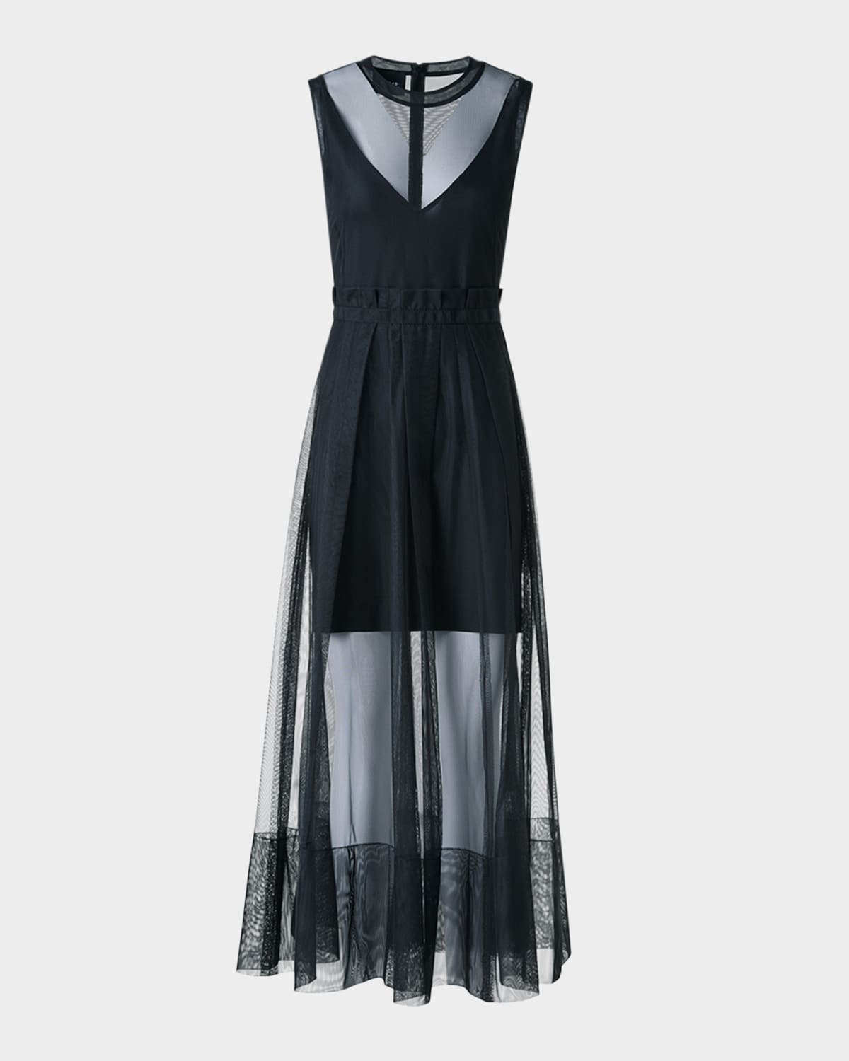 - Akris techno tulle gown with sheer paneling - Crew neckline - Sleeveless - Fit-and-flare silhouette - Hem falls below the knee - Center back zip - Silk - Lining: Viscose - Dry clean - Imported