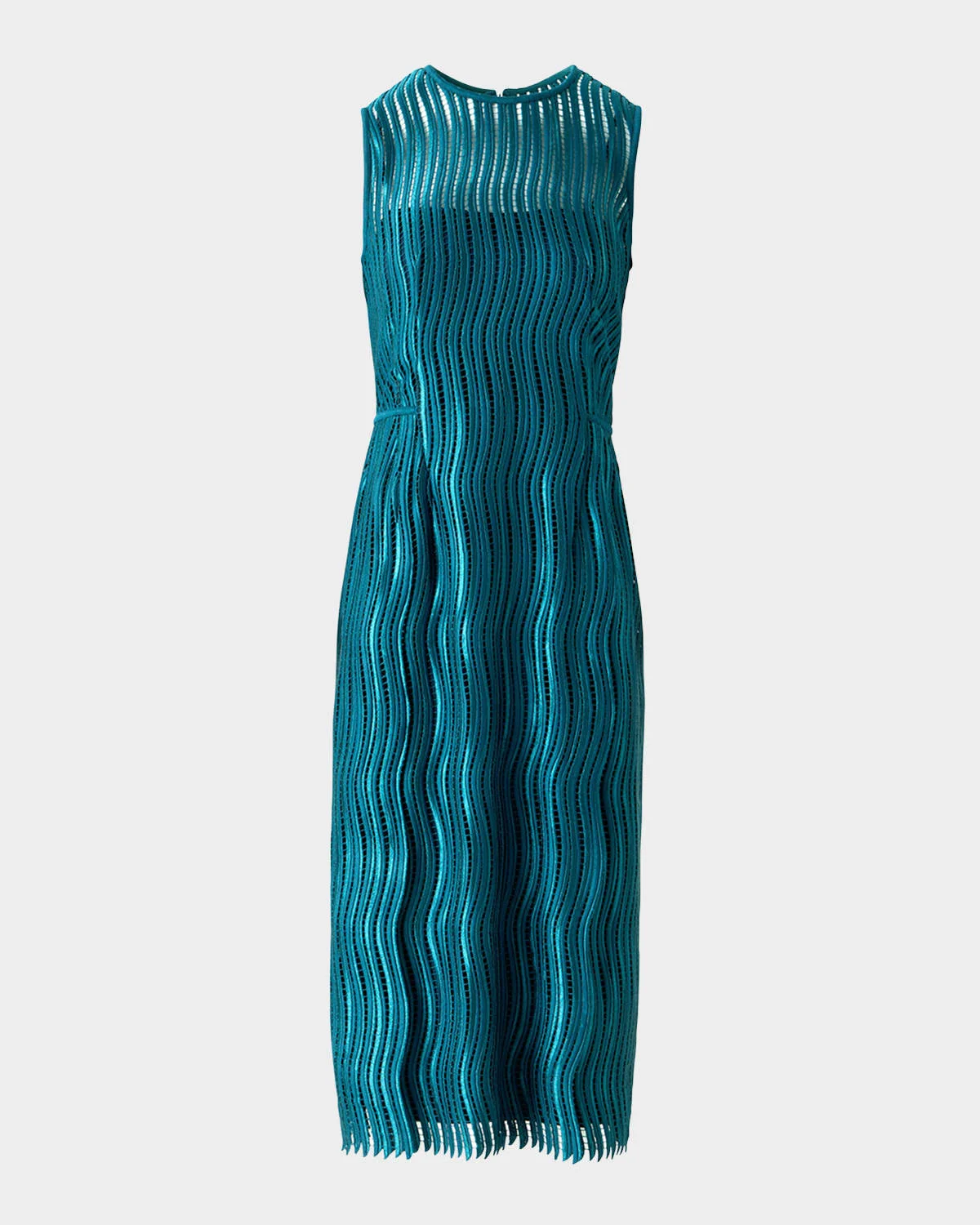 This dress from Akris is crafted from & nbsp;techno wave guipure, finished with side slits along the hem Round neckline Sleeveless Sheath silhouette Hem falls below the knee Double walking vent front Invisible back zip Polyester Lining: Viscose Dry clean Made in Romania SIZE & FITModel measurements: 5 & apos;10" tallModel is wearing a US size 4/Small