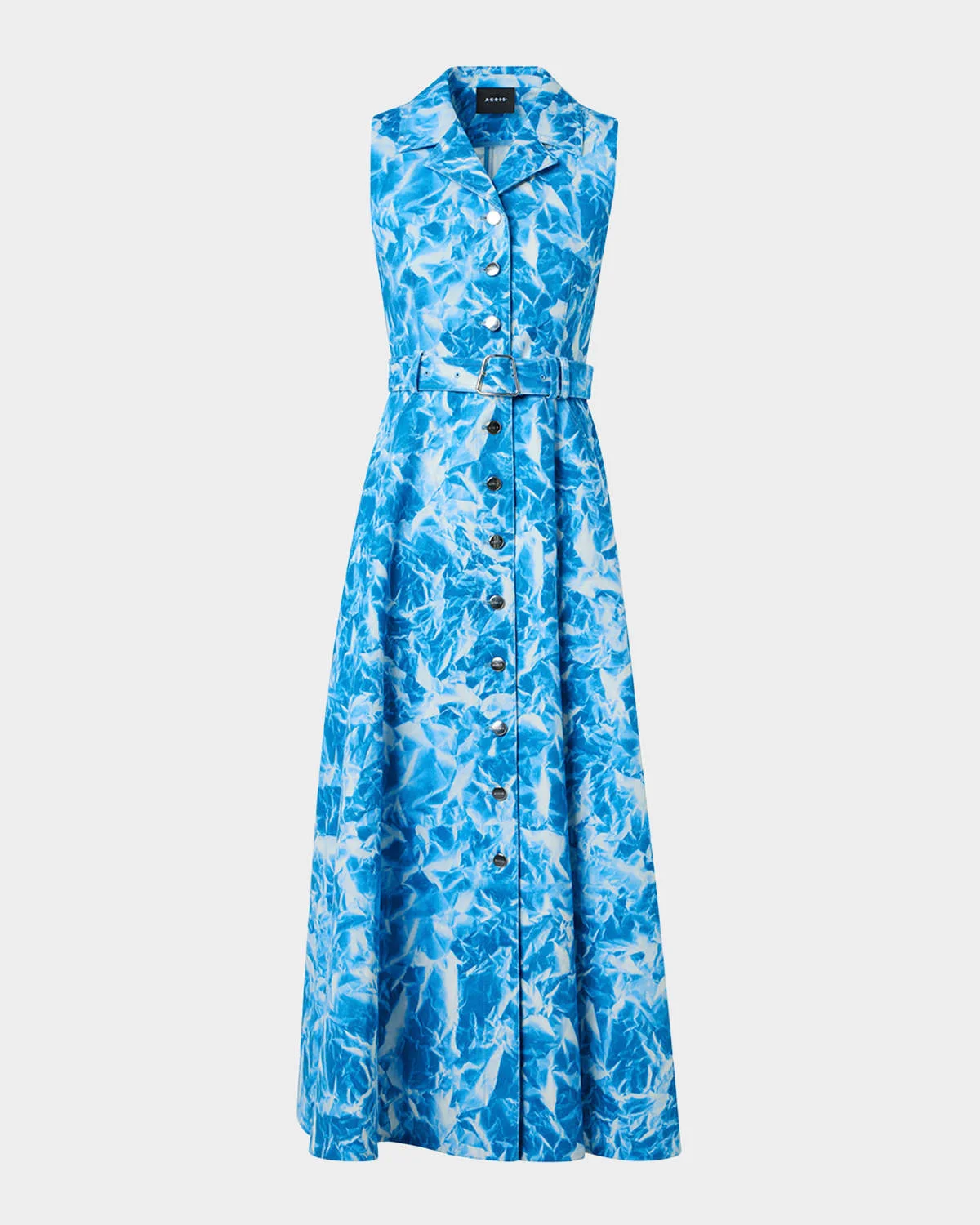 Akris shirtdress is crafted of cotton stretch denim featuring a whitecaps print and a selfbelt with a signature trapezoid buckle Notch collar; button front Sleeveless Belted waist Angled hip slip pockets Aline silhouette Hem falls below the knee Cotton/elastane Lining: Viscose/elastane Dry clean Made in Romania