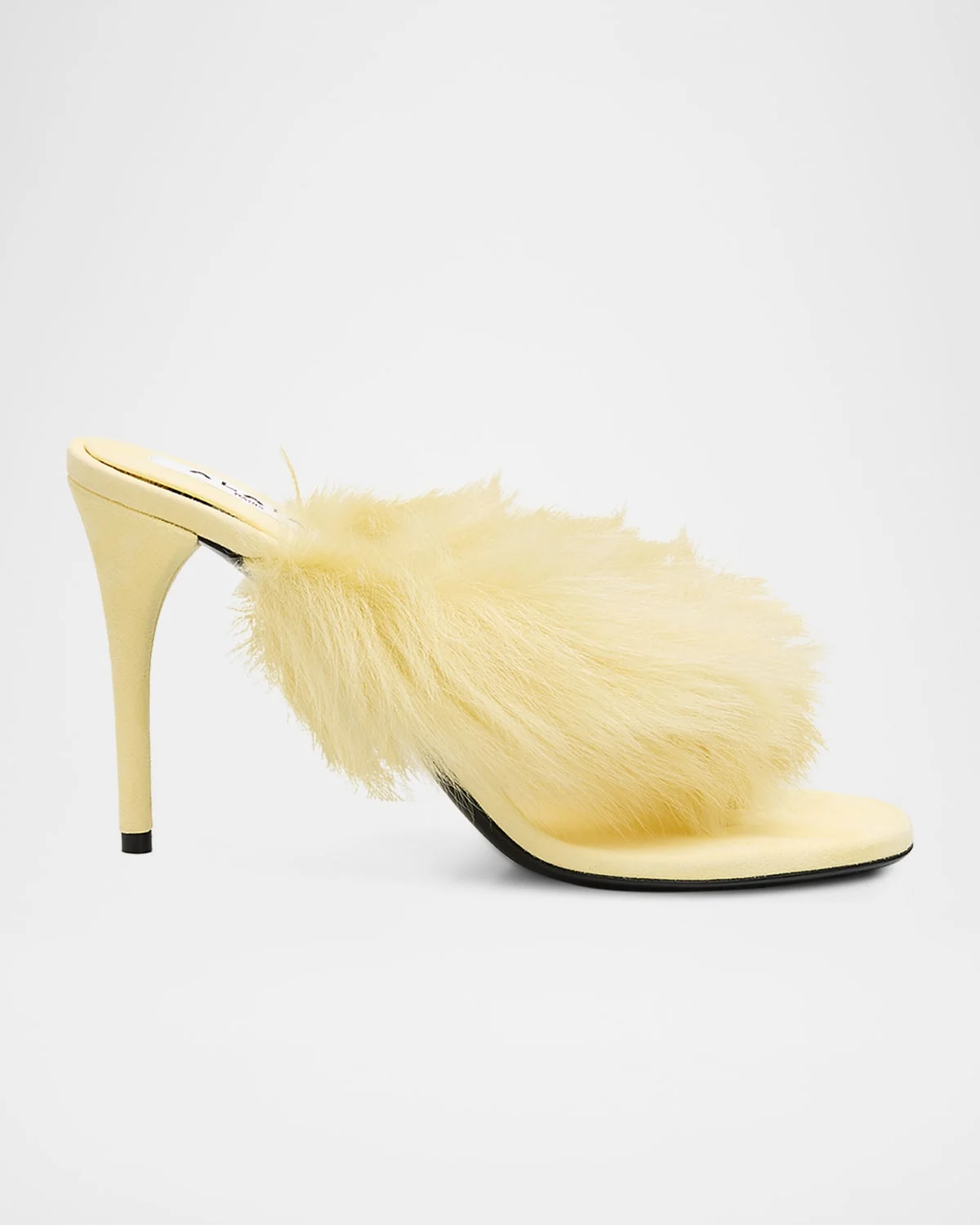 These mules by ALAIA feature a dyed sheep shearling (Italy) thong strap 3.50 in / 90 mm covered stiletto heel Rounded open toe Thong strap Slipon style Goat leather lining Leather outsole Made in Italy