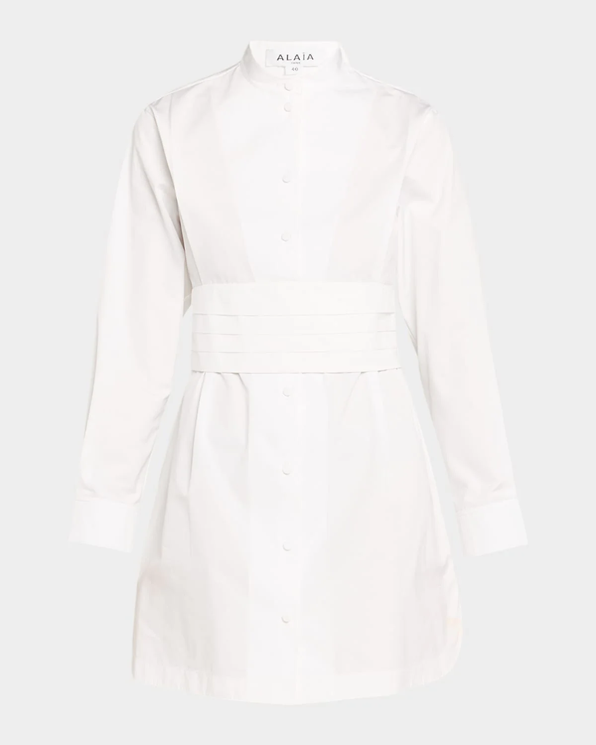 This crisp cotton shirtdress by ALAIA is adorned with an adjustable cummerbund waist Band collar; button front Long sleeves; button cuffs Shirttail hem falls above the knee Relaxed silhouette Cotton Dry clean Made in Italy