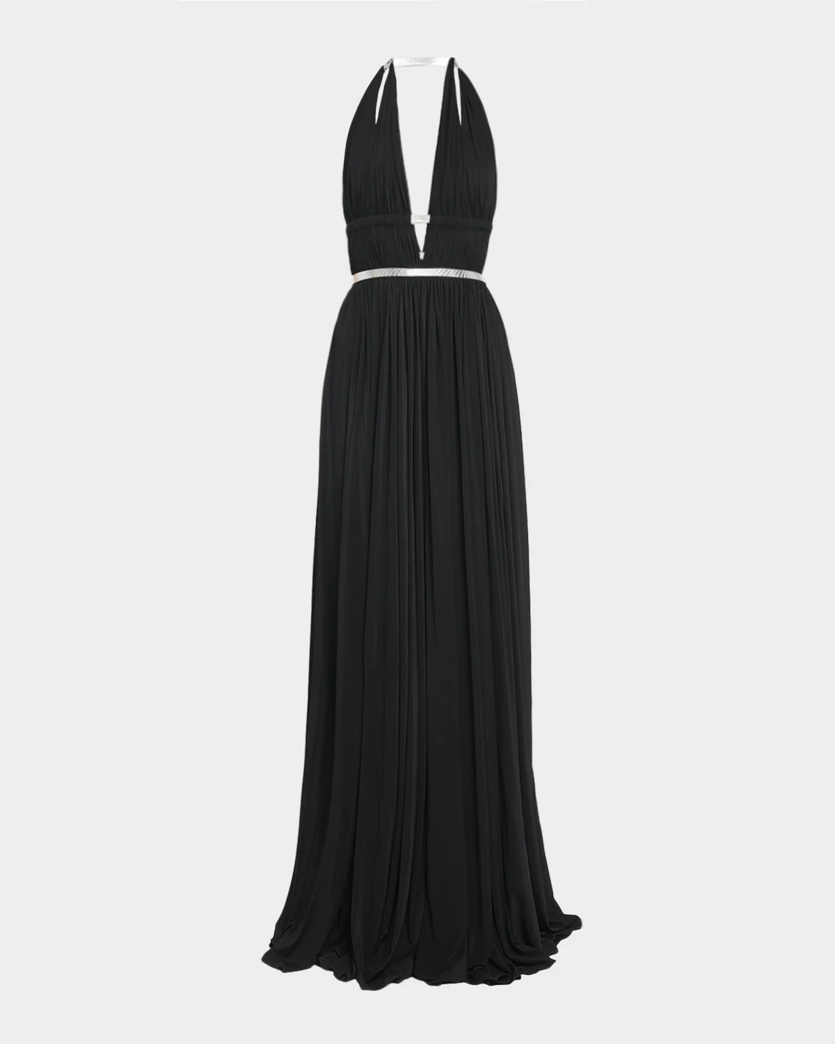 Trimmed with metallic leather belts, the "Deesse" dress from ALAIA is crafted from pleated jersey Plunging halter neckline Sleeveless Full length A-line silhouette Invisible back zipper Viscose/elastane Made in Italy SIZE & FITModel measurements: 5 & apos;10" tallModel is wearing a US size 4/Small